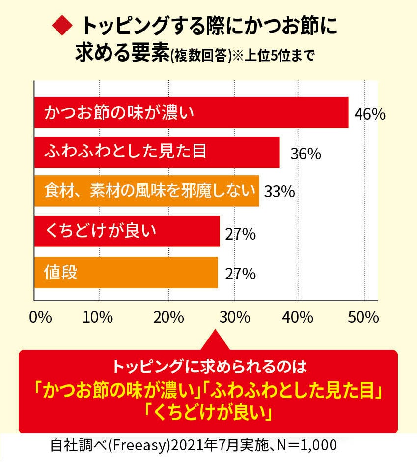削り節カテゴリーの中でもトッピング用のかつお袋タイプは伸長傾向です。自社調べ(Freaasy)により、だし取りを抑え、多くの人が花かつおをトッピングとして使用しているということがわかりました。