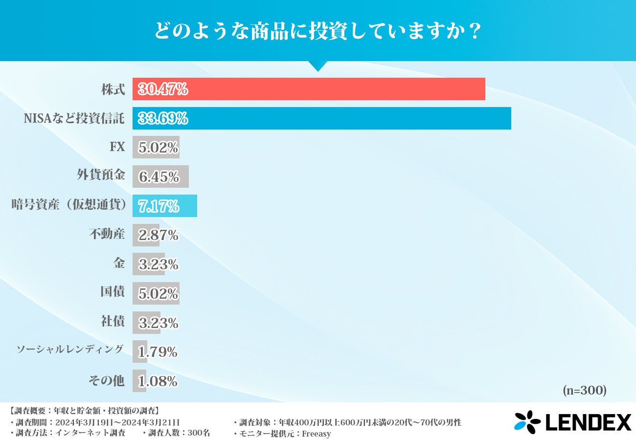 「どのような商品に投資していますか?」という質問に対し、最も多かったのは「NISAなどの投資信託(33.69%)」、次点で「株式(30.47%)」、以降は「暗号資産(仮想通貨)(7.17%)」、「外貨預金(6.45%)」、「FX(5.02%)」、「国債(5.02%)」と続く結果になりました。