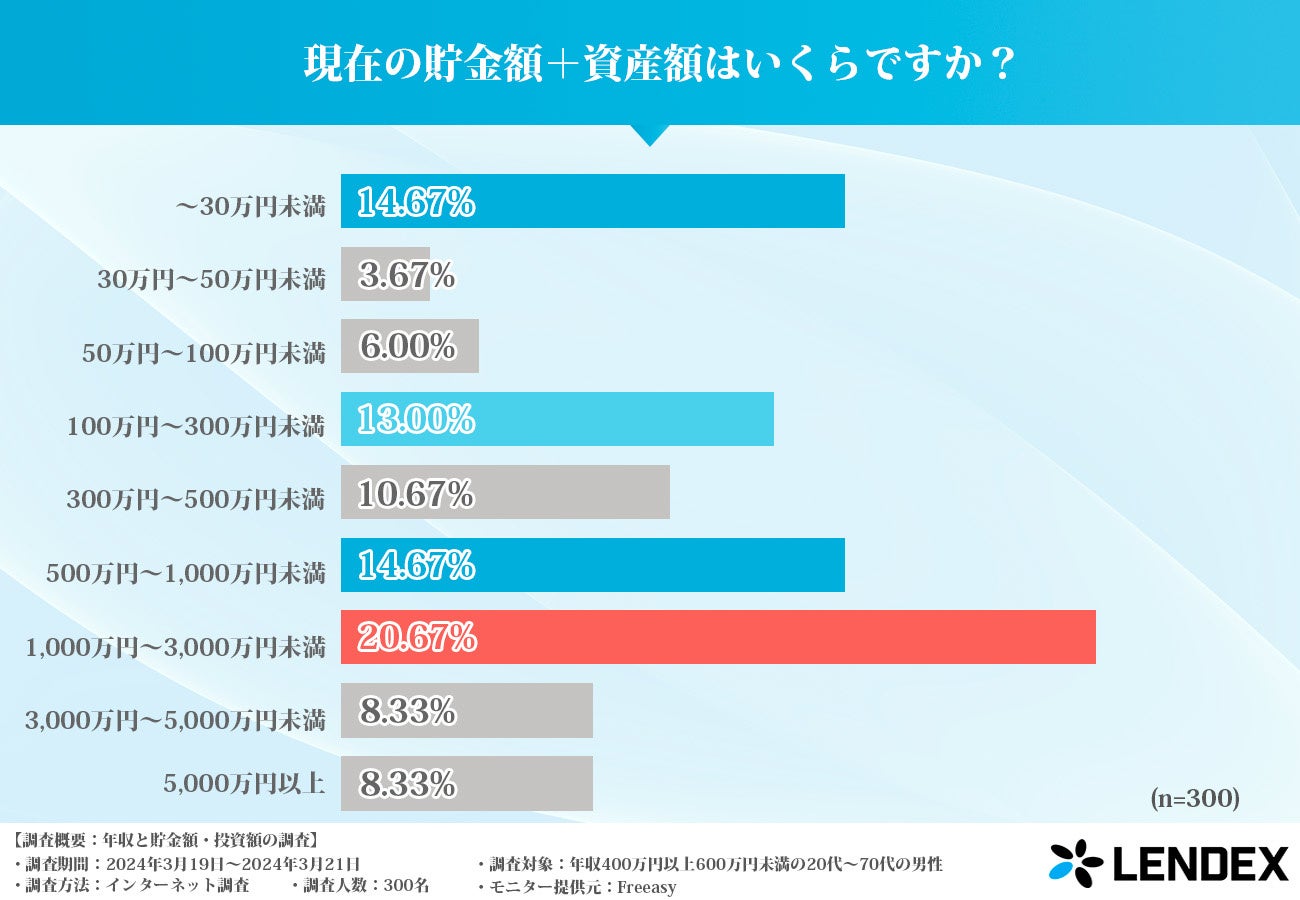 貯金額+資産額は1000万円以上3000万円未満と回答した人が最多!