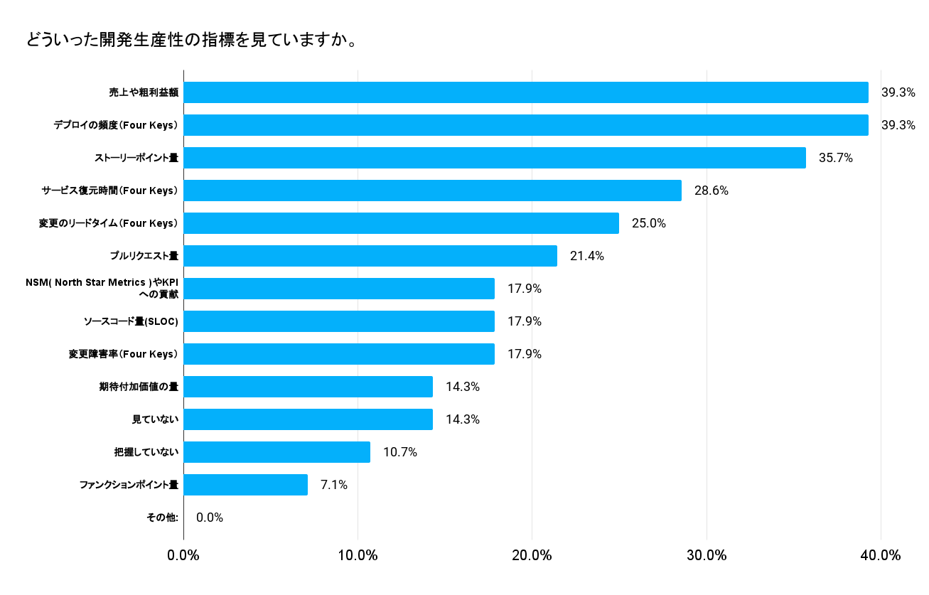 3. 現在測定指標のうち「売上や粗利益額」または、「デプロイ頻度(Four Keys)」での測定が最も多く39.3%