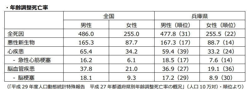 厚生労働省発表の「平成27年 都道府県別年齢調整死亡率の概況」によると、兵庫県の全死因の死亡率は全国平均と同等といえます。