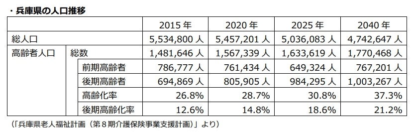 兵庫県の総人口は2020年に約545万7千人で、そのうち65歳以上の高齢者は約156万7千人で総人口の約28.7%を占めています。