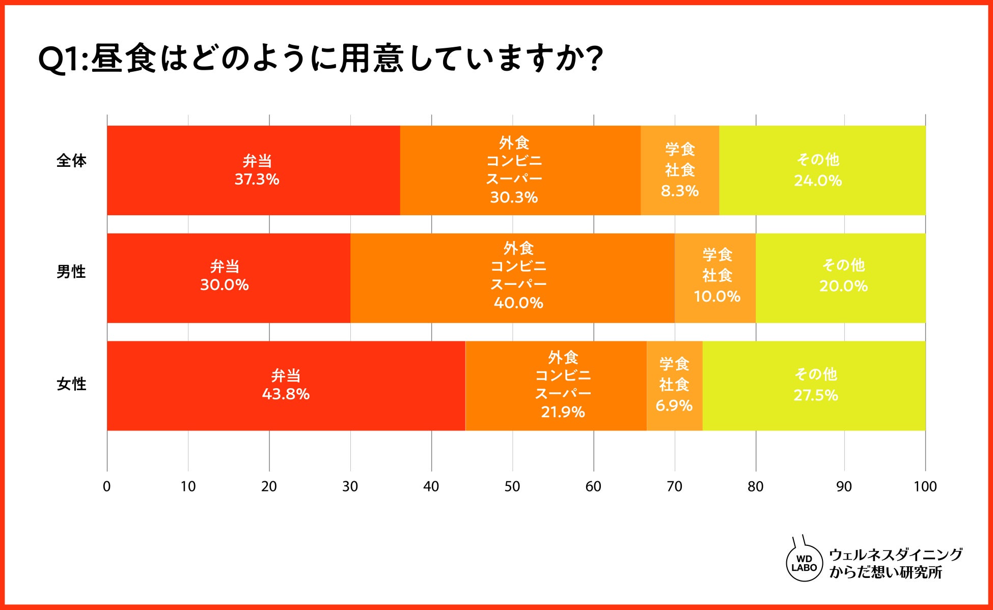 回答者の37.3%が昼食には「お弁当」を用意しており、最も多い結果となった。弁当持参者は女性に多い傾向があり、男性は「弁当」と「外食、コンビニやスーパー」で2極化している。