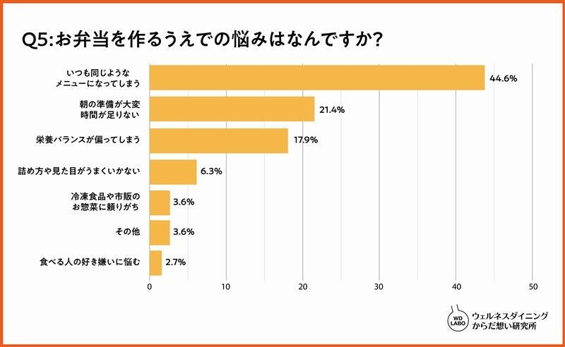 弁当を作るうえで最も多い悩みは「いつも同じようなメニューになってしまう」(44.6%)であった。次いで「朝の準備が大変・時間が足りない」(21.4%)、「栄養バランスが偏ってしまう」(17.9%)が上位となり、手間、マンネリ、健康面が主な課題であることが浮き彫りになった。