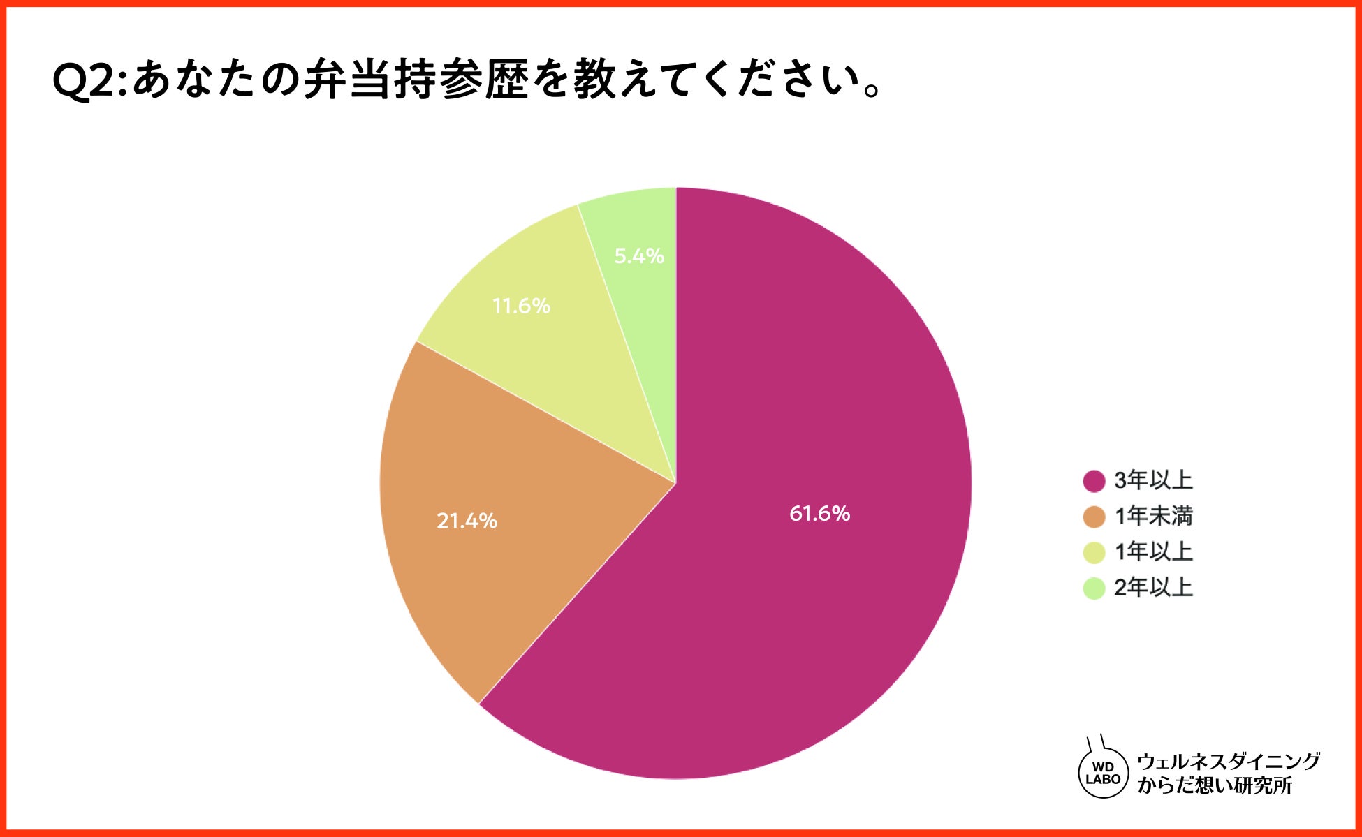 弁当持参者の約6割が3年以上続けており、習慣的に弁当を用意している。一方で「1年未満」と回答した人は21.4%となり、近年弁当持参を始めた人も一定数存在した。
