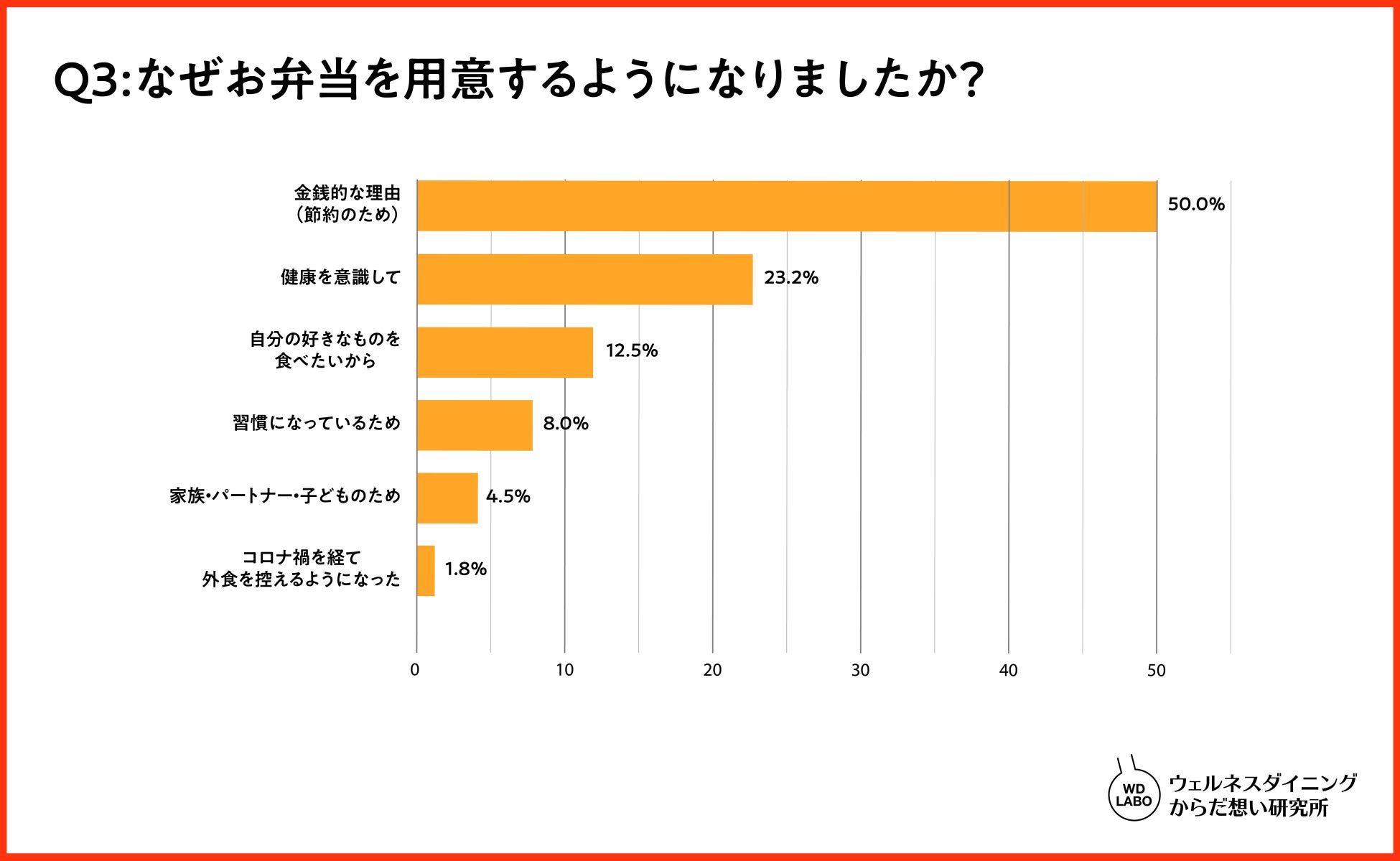 お弁当を持参する背景として、「金銭的な理由(節約のため)」が50.0%と最も多い。次いで「健康を意識して」が23.2%となり、節約志向と健康意識の高まりが、お弁当持参の大きな要因となっていた。