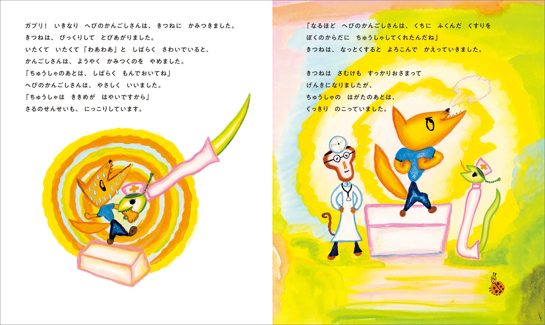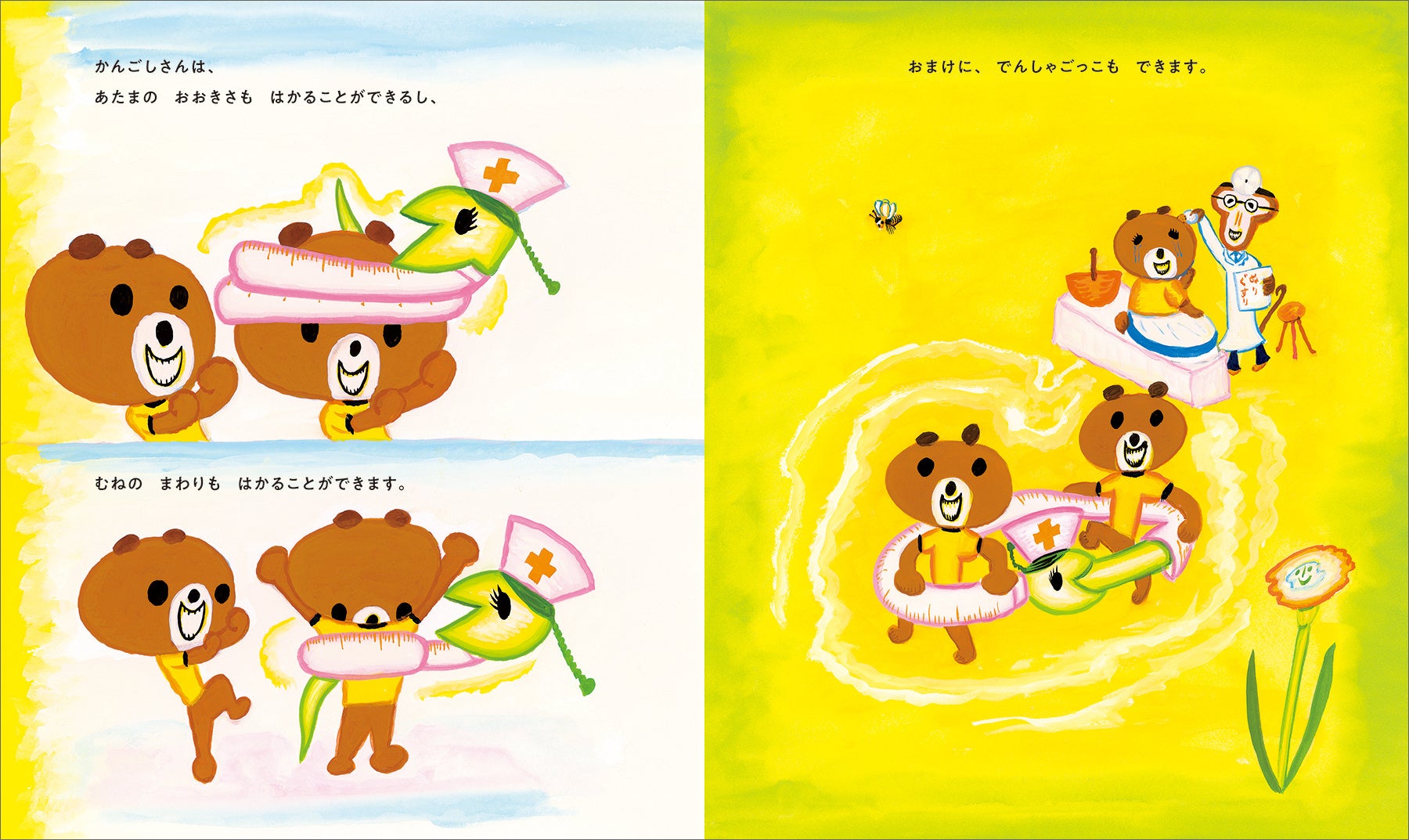 おいしゃさんは、いつもにっこりさるのせんせいと、かんごしさんは、はたらきもののへびのかんごしさんです。かぜをひいたきつね、ふたごのくまぼうやのけんこうしんだん、おなかがいたいぶた…つぎつぎとどうぶつたちがやってきます。
