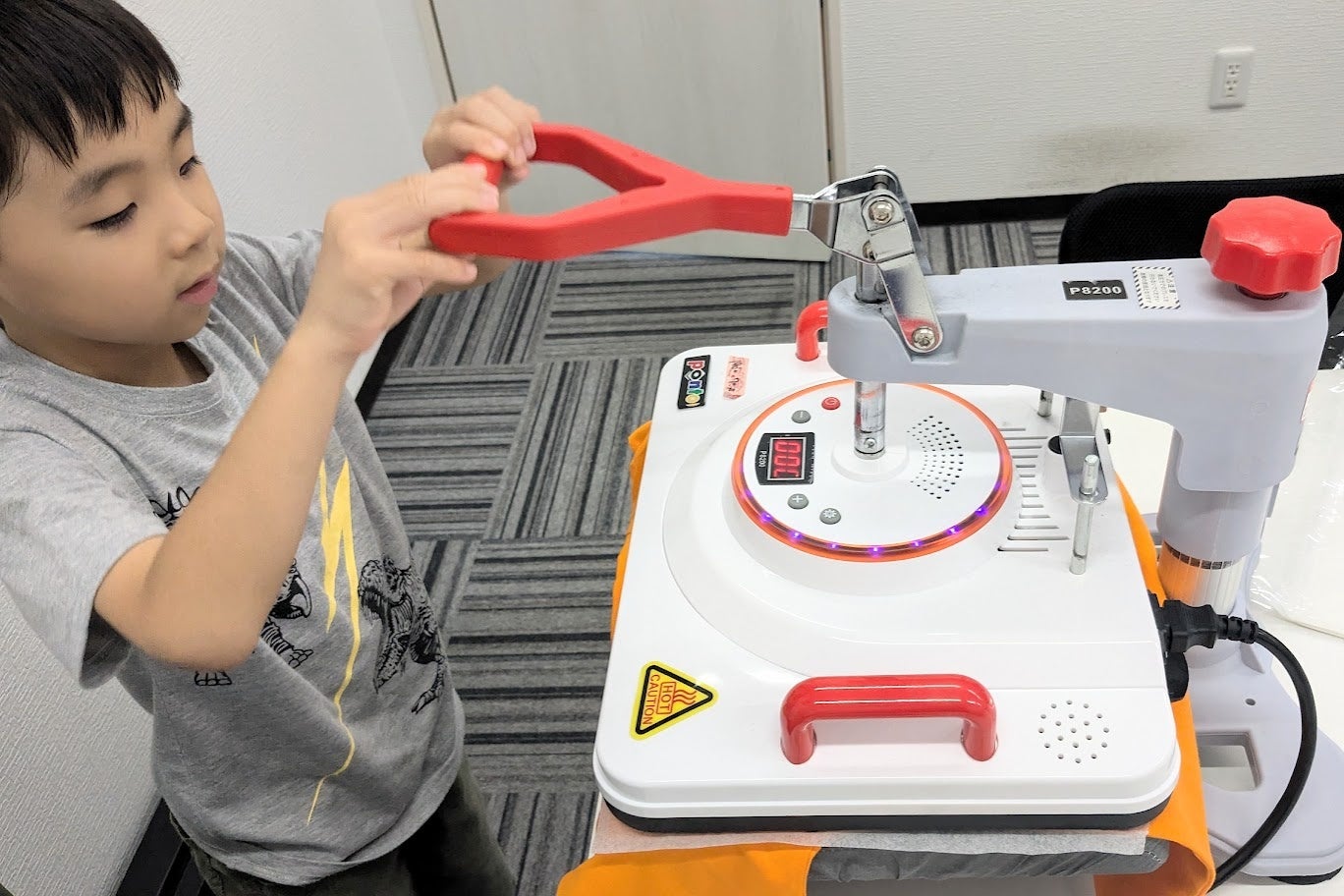 特殊な業務用デザインシートをアイテムにのせた後は、実際のノベルティグッズ製作と同様に業務用プレス機で熱を加えて、デザインをアイテムにプリントする工程も体験していただけます。