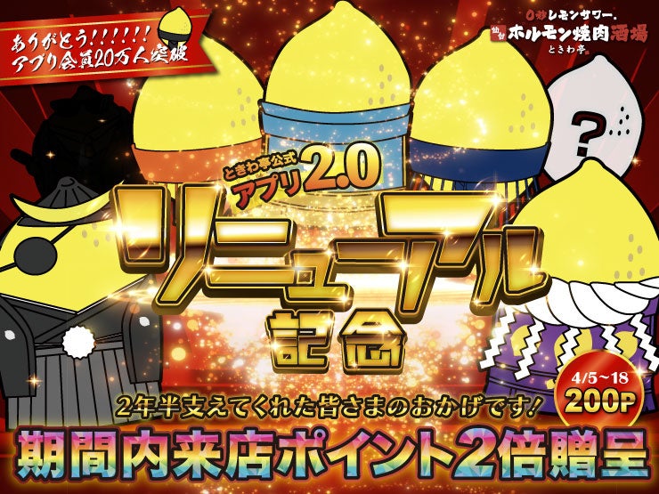 リピつくが提供する「ときわ亭」公式アプリ、アプリ会員20万人突破でリニューアルを実施┃実施記念として来店ポイント2倍キャンペーンを開催2023年4月5日~18日