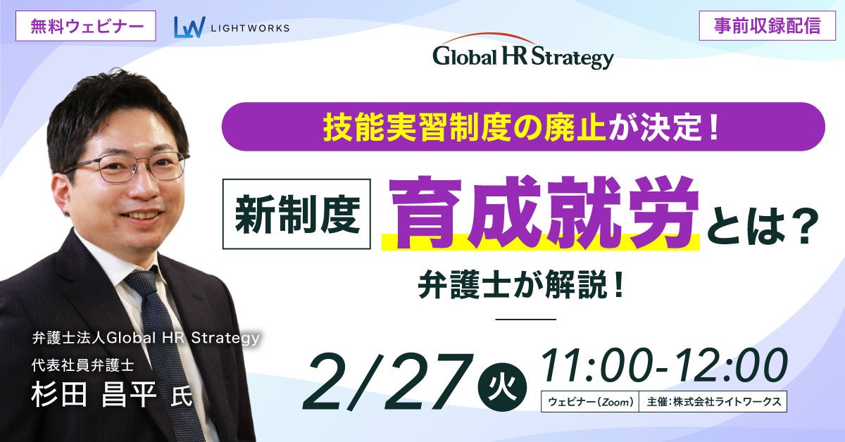 学習管理システム(LMS)や外国人雇用に特化したeラーニングサービス「まなびJAPAN」などを提供する株式会社ライトワークス(本社:東京都千代田区、代表取締役:江口夏郎、以下「ライトワークス」)は、2023年2月27日(火)に外国人材受け入れの新制度「育成就労」の政府方針を弁護士・杉田 昌平氏が解説する無料ウェビナーを開催いたします。