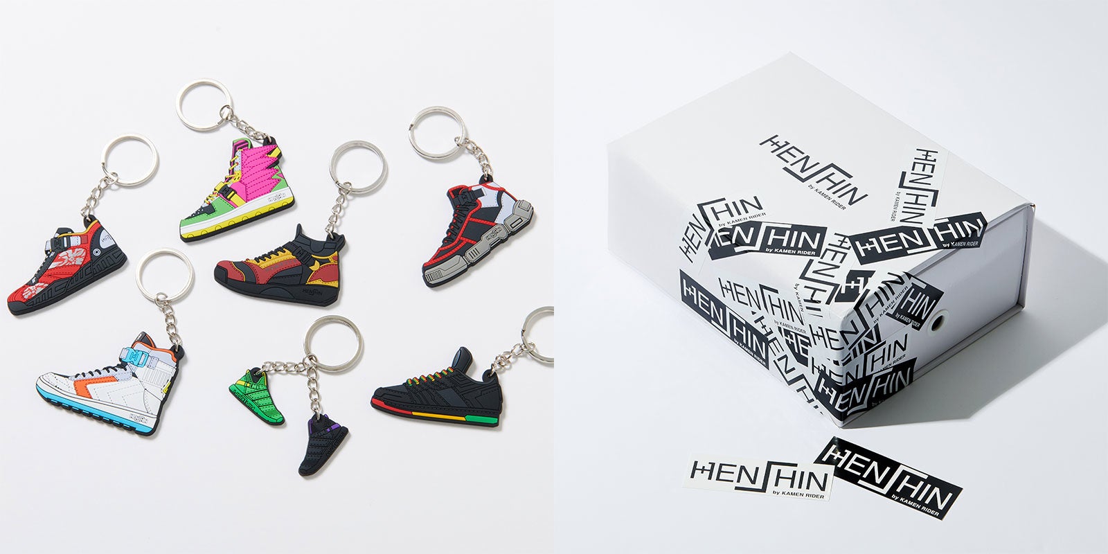 阪急メンズPOP UP店頭で対象商品を購入したお客様にはHENSHIN by KAMEN RIDERのスニーカーモチーフのラバーチャームをプレゼントします(7種のうちランダムで一つ、準備数に達し次第終了)。