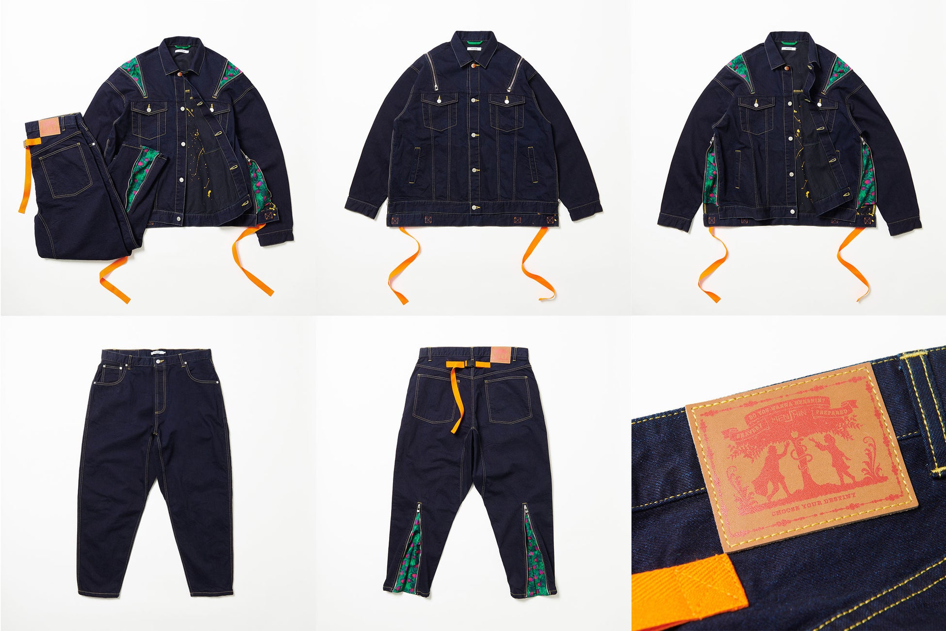 さらに裏面には仮面ライダー鎧武の変身時に演出される「果汁」をペイントで表現しています。セットアップで着用できるデニムパンツもファスナーの開閉でシルエットをアレンジできることに加えて、バックに付属する革パッチも仮面ライダー鎧武をモチーフにしたオリジナルデザインを採用しています。使用しているデニム生地は古くから存在する紺色の一種で、武士が好んだ色である「勝色」を採用することで仮面ライダー鎧武とリンクさせています。