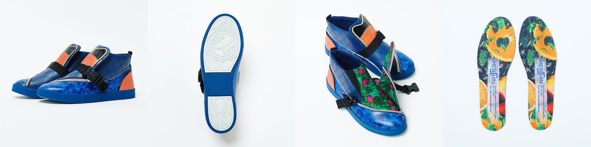 スニーカーは国産にこだわり、京都のぼかし染め職人の手によって手作業で染められたアッパーが特徴です。大胆にあしらわれたファスナーを開けることで仮面ライダー鎧武の劇中に登場する「ヘルヘイムの森」につながる演出が番組設定とリンクします。アウトソールは仮面ライダー鎧武の公式設定を再現しています。