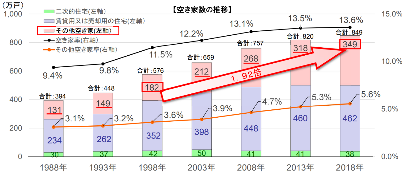 国土交通省が発表した「空き家政策の現状と課題及び検討の方向性」によると、1988年から2018年の20年間で空き家総数は約1.5倍、「その他の空き家」の数は約1.9倍に増加しています。また、住宅ストック(既存の建物で売りに出されている住宅)の住宅総数に対する空き家率は、9.4%から13.6%に増加しています。