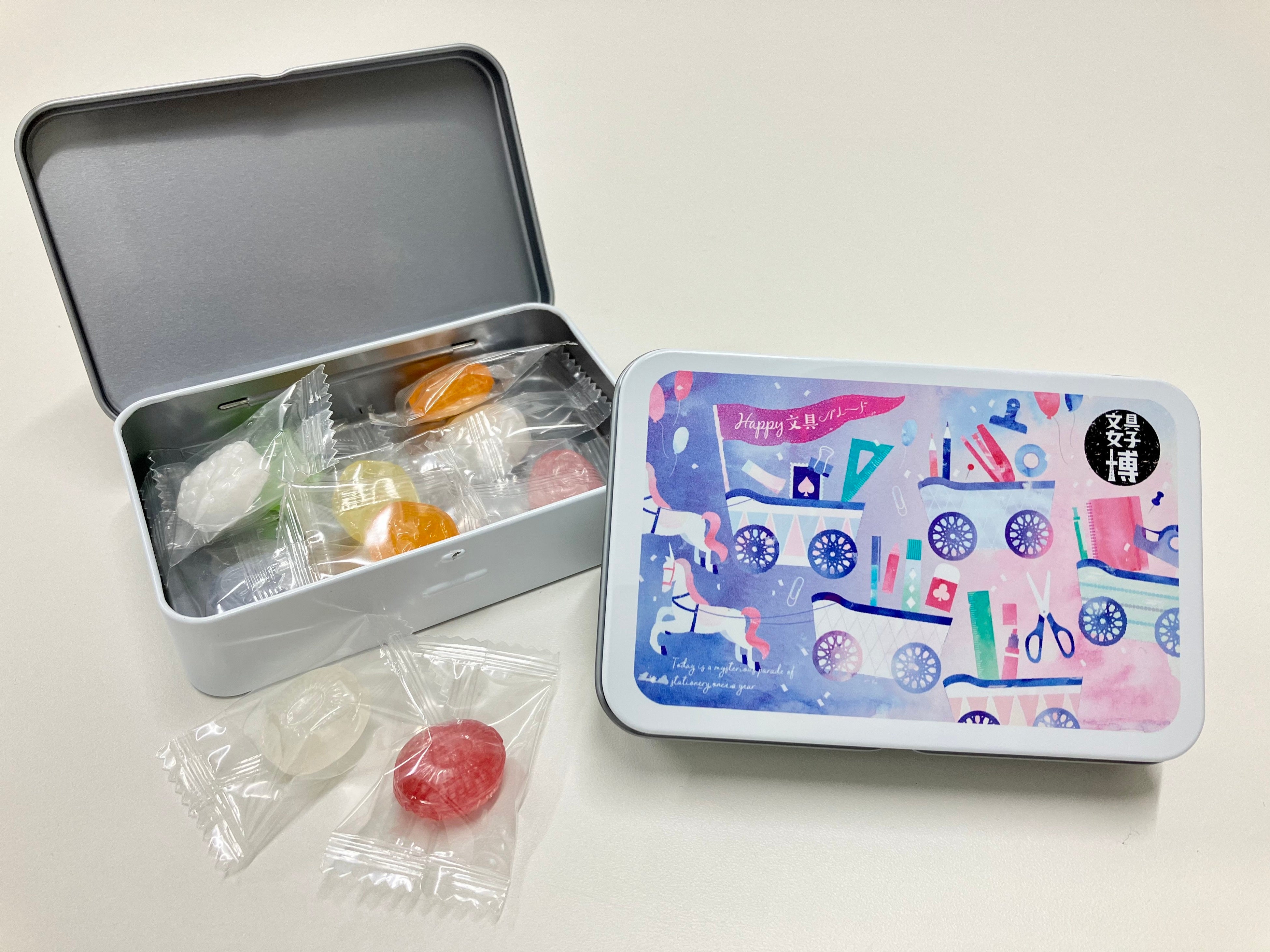 今回のテーマ「Happy 文具パレード」に合わせたラインナップでご用意!どれも文具女子博限定デザインです。ご来場の記念にも、周りの文具ファンへのお土産にも!さらに、「文具女子博pop-up in池袋」メインビジュアル柄の「オリジナルキャンディ缶」が登場!この機会にぜひお買い求めください。
