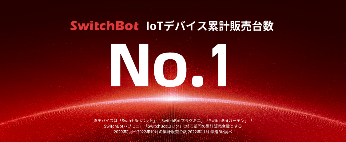 SwitchBotは、世界100以上の国や地域に向けIoTスマートホームデバイスの企画、製造、販売を行うスマートホームブランドです。従来の家具や家電を後付けでスマート化できる便利性や自由に組み合わせられる拡張性の高さが評価され、日本国内のユーザーは100万世帯超え、販売累計台数は500万台を突破しました。 また、おかげさまで弊社の「SwitchBotボット」「SwitchBotプラグミニ」「SwitchBotカーテン」「SwitchBotハブミニ」「SwitchBotロック」の計5製品が「IoTデバイスNo.1」を獲得。さらに、SwitchBotプラグミニ、SwitchBotカーテン、SwitchBotハブミニ、SwitchBotロックがそれぞれ「IoTデバイス スマートプラグ 売上No.1」「IoTデバイス カーテン 売上No.1」「IoTデバイス スマートリモコン 売上No.1」「IoTデバイス スマートロック 売上No.1」を獲得いたしました。今後も手軽にスマートホームが実現できるクリエイティブな製品を提供できるよう、先端技術の開発・改善に努めてまいります。