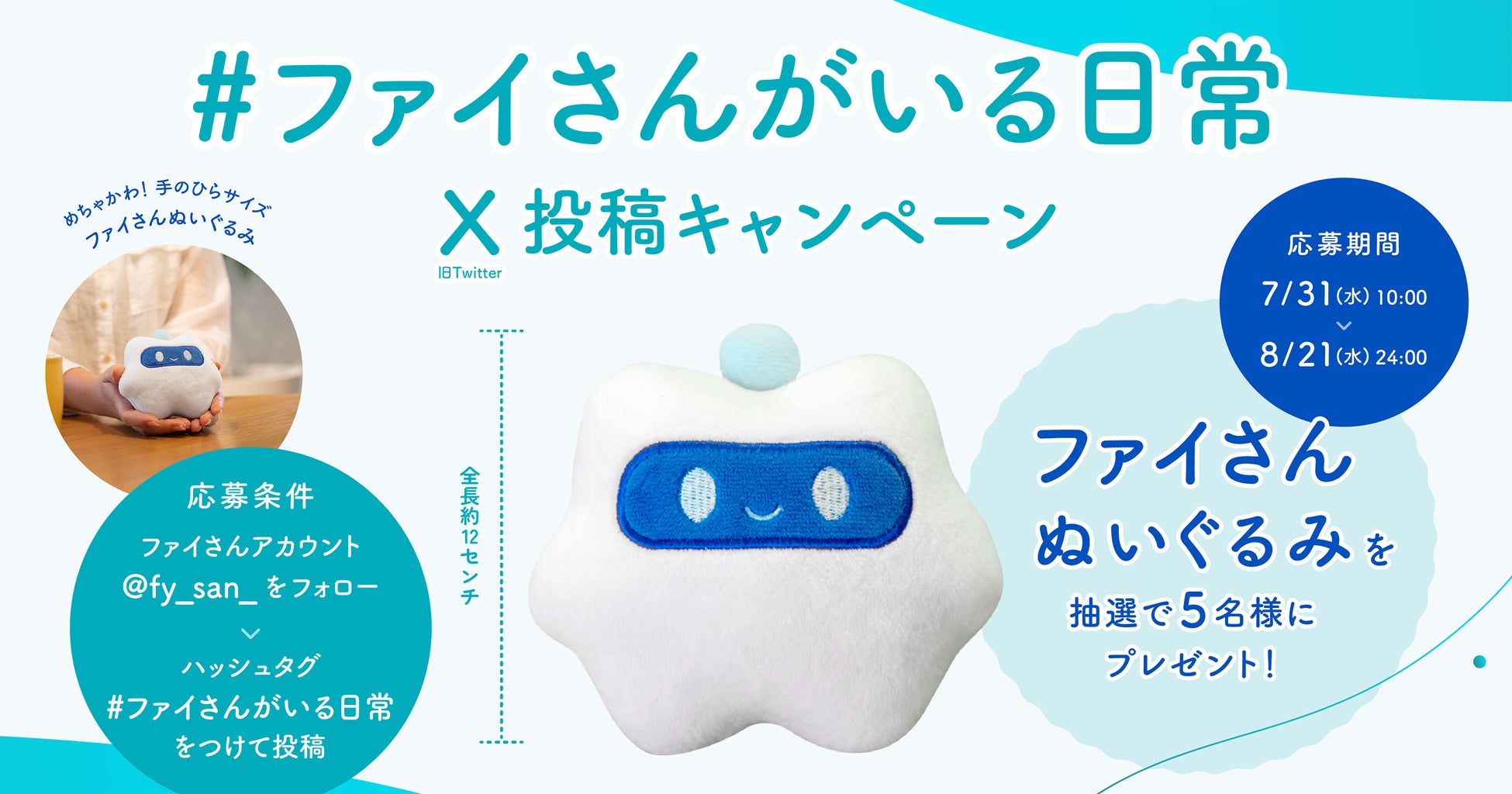 この度、ブランドコンセプトムービーの公開を記念して、「ファイさんがいる日常」をテーマに投稿キャンペーンを実施します!キャンペーンにご参加いただきました方には、抽選で5名様に「ファイさんぬいぐるみ」をプレゼントいたします!