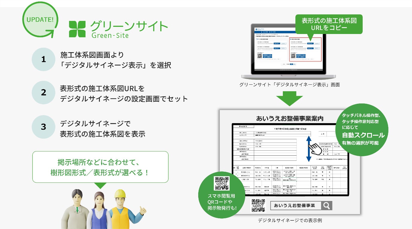 労務安全書類作成・管理サービス「グリーンサイト」施工体系図の表形式表示がデジタルサイネージに対応