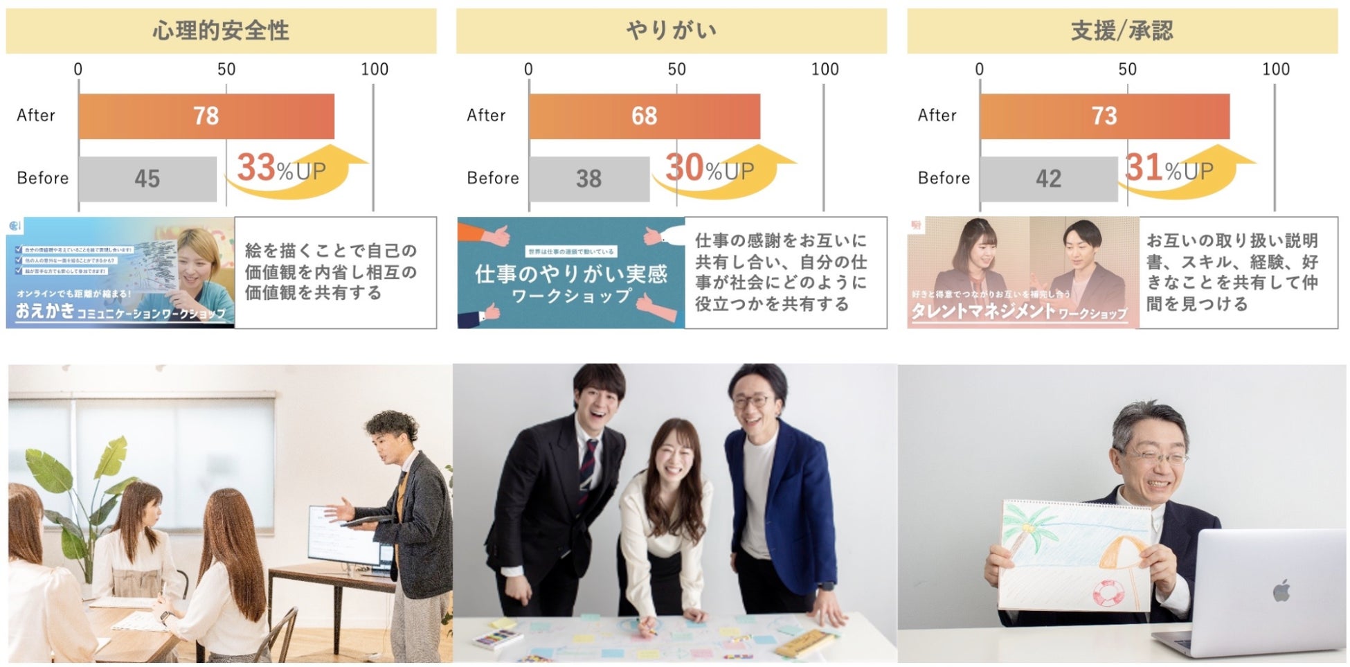 900社のエンゲージメント向上を支援したノウハウに基づき、効果的で実現性の高い最適な対策のアドバイスを提供します。アドバイスだけではなく、2,500回以上の実績かつエンゲージメント向上率95%を記録する、弊社ファシリテーションによる自組織のエンゲージメント改善ワークショップを実施も可能です。
