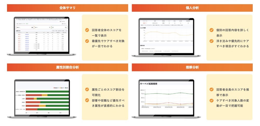回答者全体のスコアを一覧で表示し、最優先でケアすべき対象が一目でわかります。 -