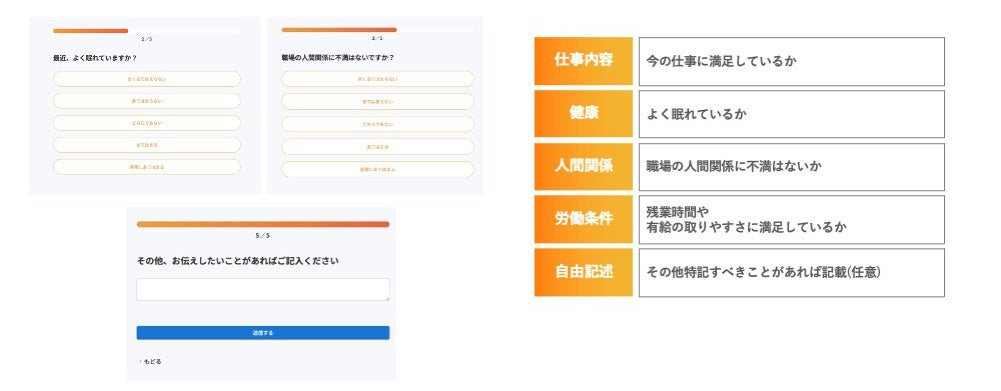 簡潔な5つの質問で構成されているため、従業員の負担を最小限に抑えつつ、定期的なモニタリングを実現します。
