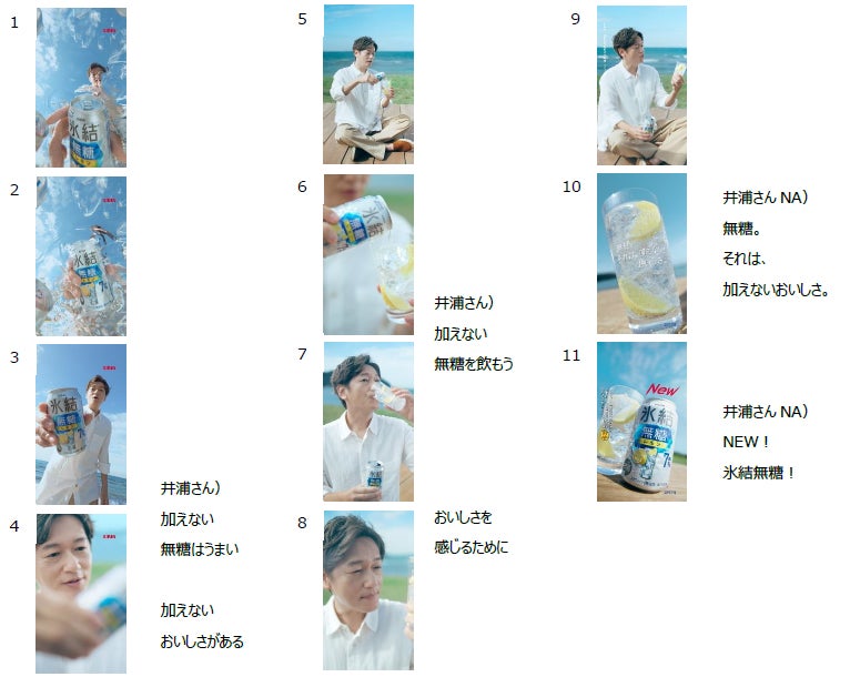 青い空と海をバックにしたウッドデッキで、井浦さんが氷の入ったグラスに「氷結®無糖」を注ぎながら、THE BLUE HEARTSの名曲「終わらない歌」の替え歌をアカペラで歌っています。「加えない無糖はうまい~♪」「加えないおいしさがある~♪」「加えない無糖を飲もう~♪」「おいしさを感じるために~♪」と口ずさみながら、「氷結®無糖」をひと口飲んですっかり気分が上がっていく井浦さん。思わずその気持ちを声に出して、笑顔になる姿を描写したストーリーを通じて、「無糖。それは、加えないおいしさ。」という新ブランドメッセージを印象的に訴求していきます。