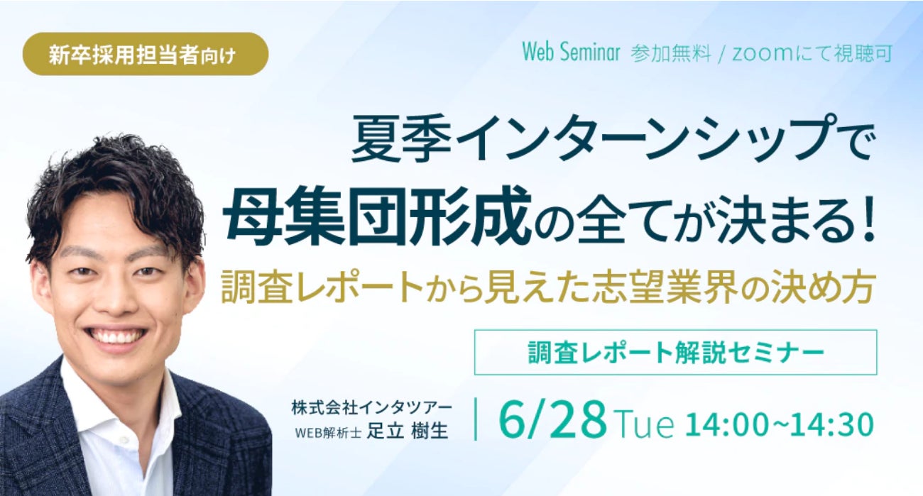 本セミナーでは、5月、6月に当社から発行した調査レポートの解説を行いながら「学生が志望業界を決定するタイミング」や「夏季インターンシップの選び方」について紐解き、採用広報の組み立てについて解説します。