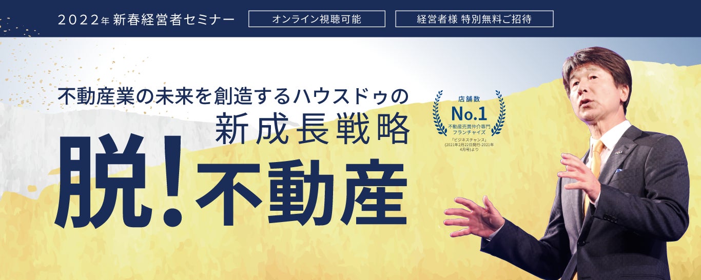 創業当時から一貫した理念で突き進んできた安藤は、不動産業の進化型として「脱!不動産」という新たなチャレンジに乗り出しました。安藤が見据える不動産業の未来、そこに至るハウスドゥの役割と戦略についてお話しさせていただきます。ハウスドゥは、不動産業の輝かしい未来と日本経済の成長に向けて加速をやめません。ぜひ、あなたもセミナーにご参加いただき、ご一緒に未来を変えてみませんか?