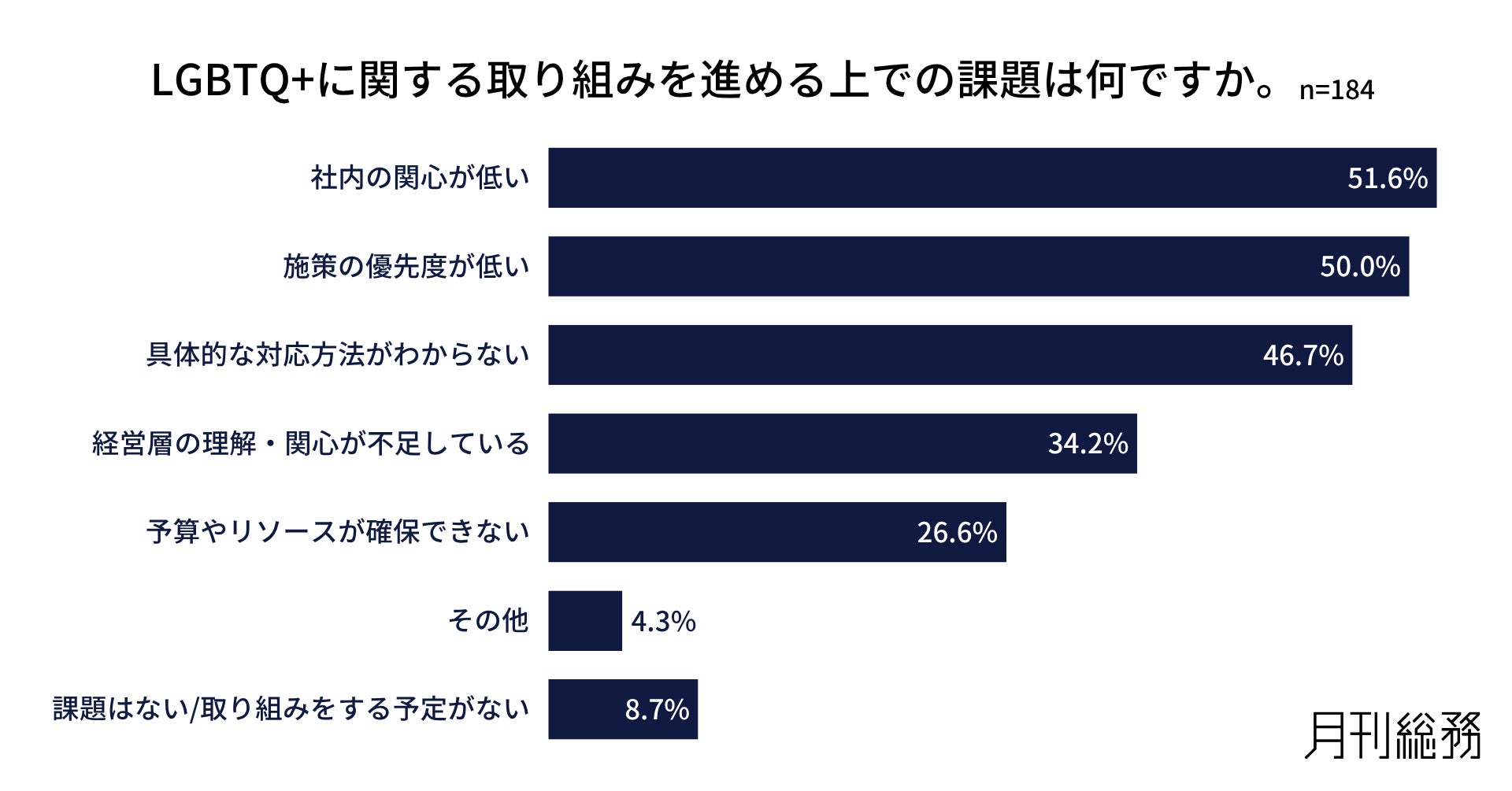 LGBTQ+への取り組みを進める上での課題について尋ねたところ、「社内の関心が低い」が51.6%で最多となり、「施策の優先度が低い」50.0%、「具体的な対応方法がわからない」46.7%と続きました(n=184)。
