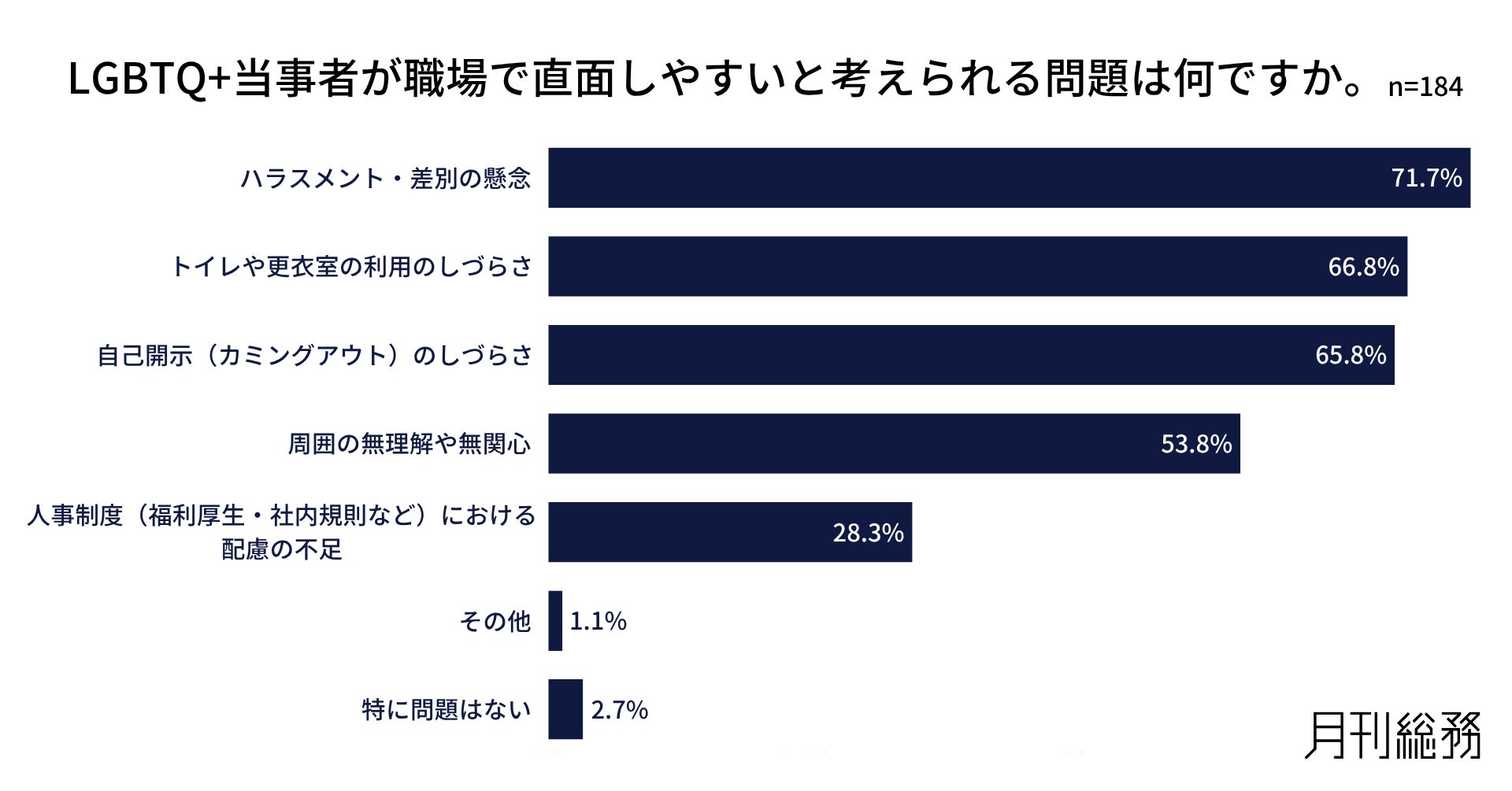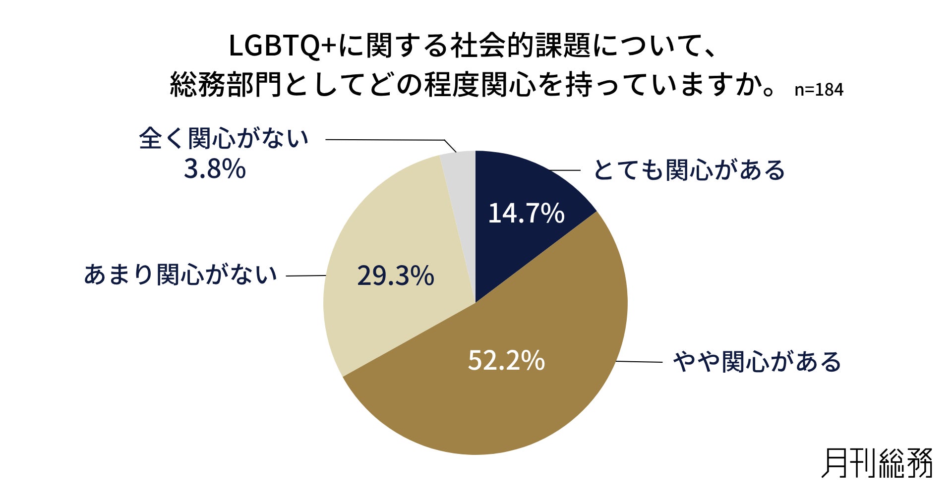 日本で唯一の総務専門誌『月刊総務』を発行する株式会社月刊総務(所在地:東京都千代田区、代表取締役:豊田健一)は、全国の企業を対象に「LGBTQ+に関するアンケート調査」を実施し、184名から回答を得ました。