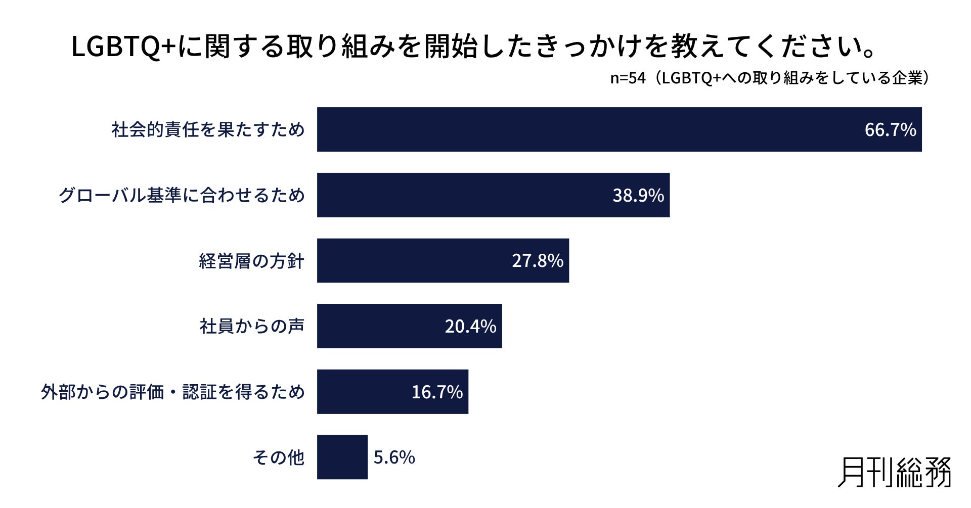 LGBTQ+への取り組みを始めたきっかけについて尋ねたところ、「社会的責任を果たすため」が66.7%で最多となり、「グローバル基準に合わせるため」38.9%、「経営層の方針」27.8%が続きました(n=54/LGBTQ+への取り組みをしている企業)。