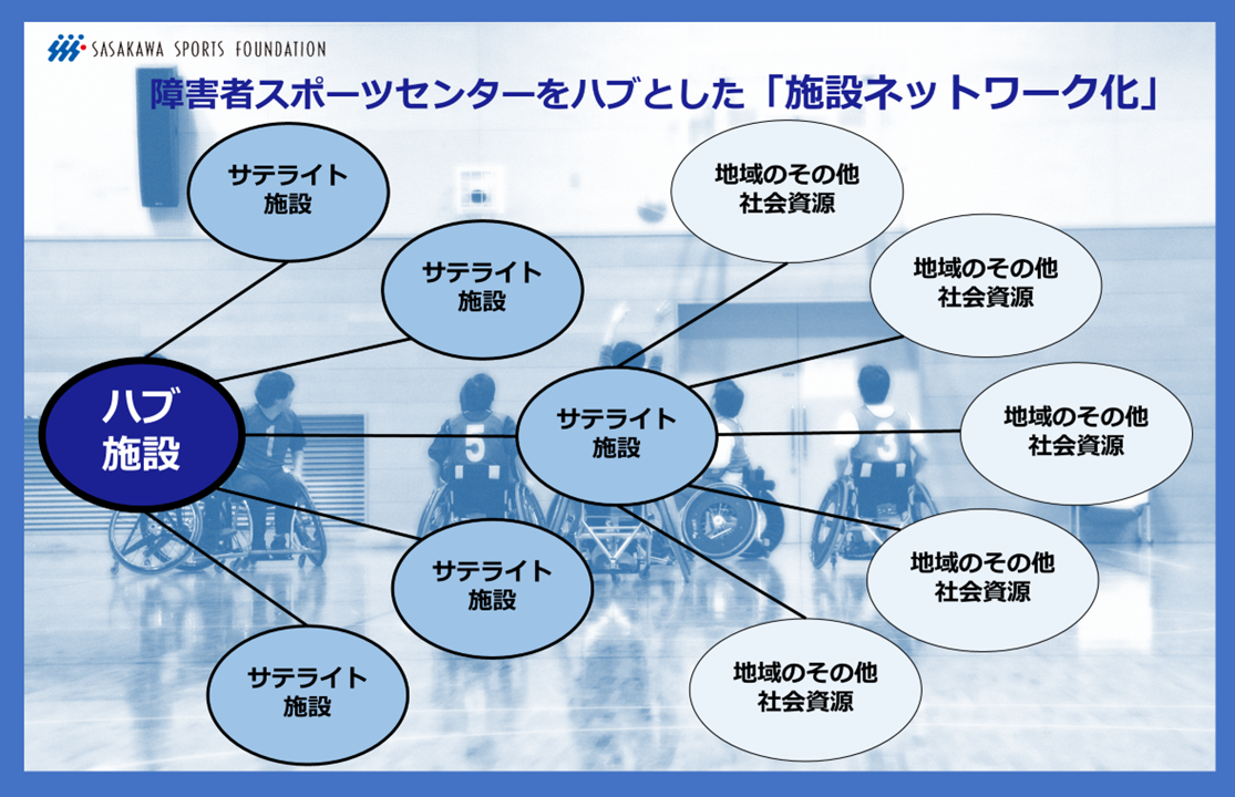 障害児・者のスポーツの日常化には、地域の障害者スポーツセンター(ハブ施設)を中心に、周辺の障害者専用・優先スポーツ施設や公共スポーツ施設などのサテライト施設、地域のその他社会資源がネットワーク化すること。