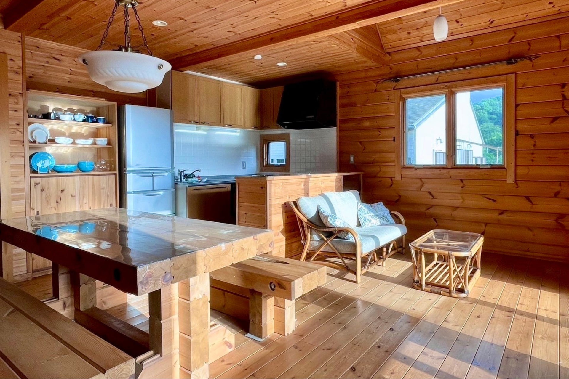 建物は、竣工から18年が経過したBESSのログハウス。リビングルームはまるで室内に自然を取り込んだような空間。そして、経年により木肌がアメ色に変化し、ビンテージ家具のような味わいや風格がプラスされています。ログハウスは在来木造住宅の約3倍もの木を使うため、床も壁も天井も木に囲まれる空間に身を置くという非日常感が別荘ライフを盛り上げてくれます。