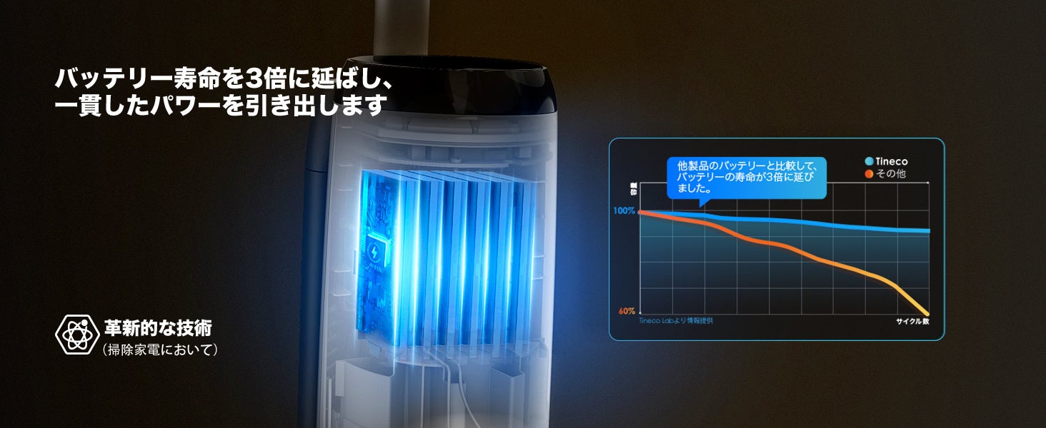 デジタルパウチ電池のご使用より、バッテリーの連続使寿命を3倍に伸ばし、より耐久性がある。デジタルパウチ電池とは、スマホやパソコンでよく使えている充放電回数が高い電池です。Tineco独自開発のバッテリーでは充放電回数は900以上で、長持ちに使えます。