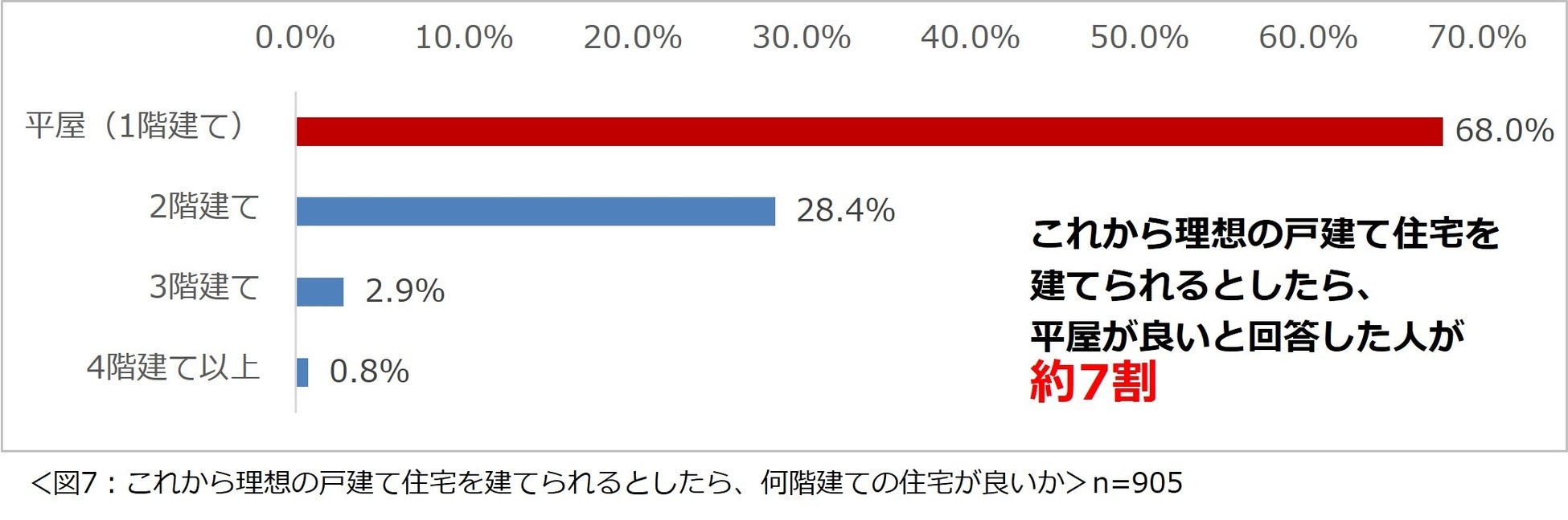 「もしこれから理想の戸建て住宅を建てられるとしたら、何階建ての住宅が良いですか?」と尋ねたところ、68%の人が「平屋」が良いと回答しています。(図7)