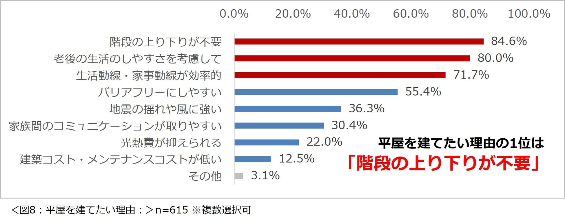 これから理想の戸建て住宅を建てるなら「平屋」が良いと回答した615名に理由を尋ねたところ、「階段の上り下りが不要」という回答が最も多く(84.6%)、次いで「老後の生活のしやすさを考慮して」(80%)、「生活動線・家事動線が効率的」(71.7%)という結果になりました。(図8)