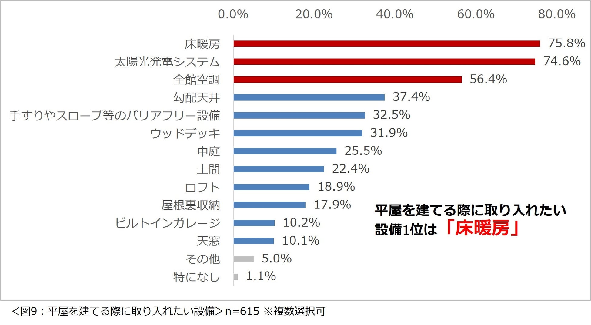 平屋を建てる際に取り入れたい設備について尋ねたところ、「床暖房」という回答が最も多く(75.8%)、次いで「太陽光発電システム」(74.6%)、「全館空調」(56.4%)という結果になりました。(図9)