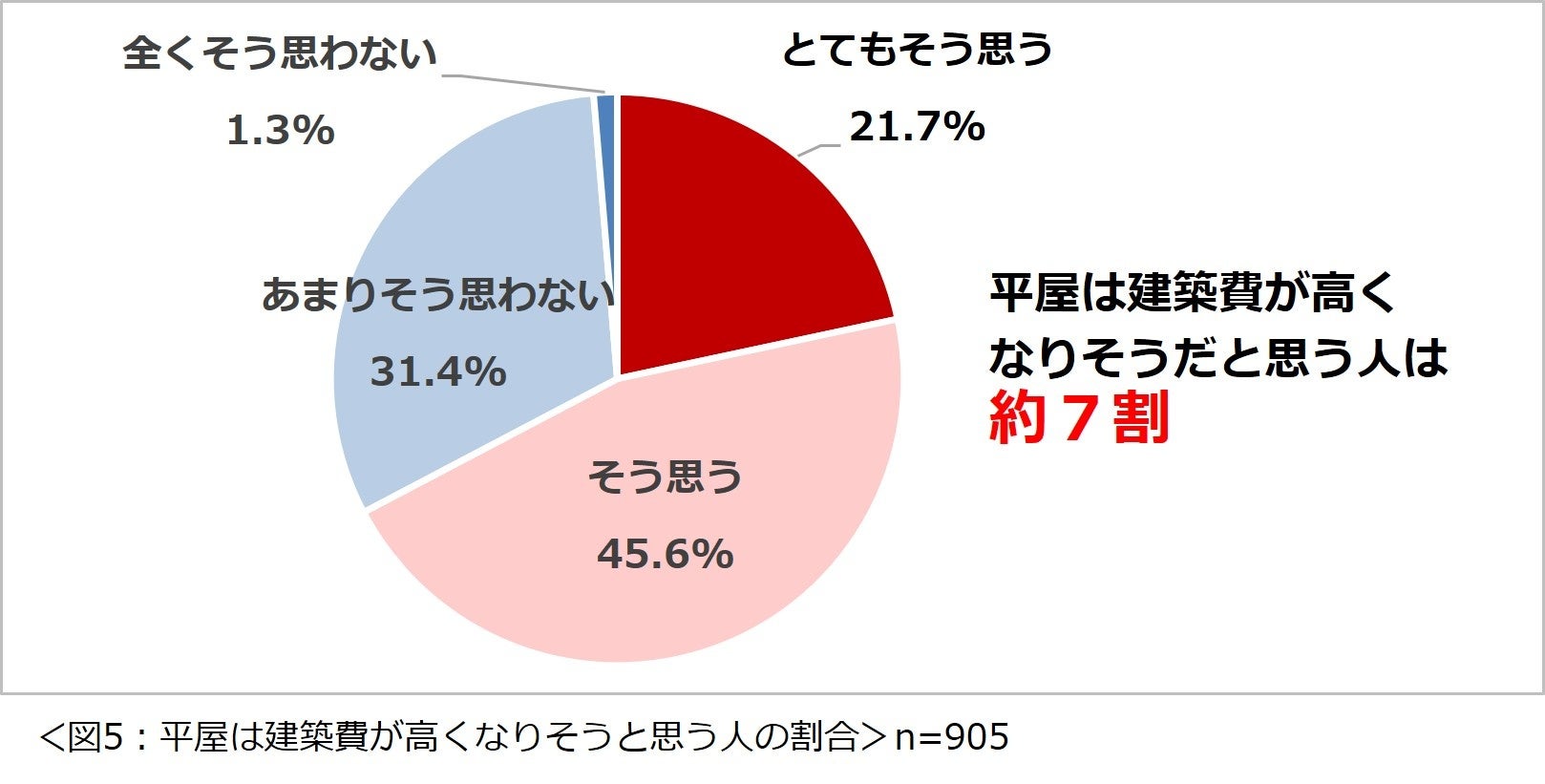 また、「平屋は建築費が高くなりそうだと思いますか?」と尋ねたところ、「とてもそう思う」(21.7%)、「そう思う」(45.6%)を合わせると、67.3%の人が、建築費が高くなりそうだと感じていることが分かりました。(図5)