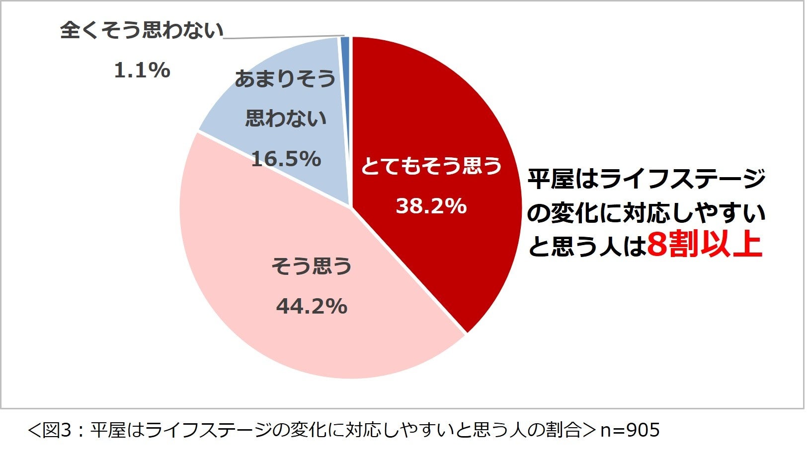 さらに「平屋はライフステージの変化に対応しやすいと思いますか?」と尋ねたところ、「とてもそう思う」(38.2%)、「そう思う」(44.2%)を合わせると、82.4%の人が、ライフステージの変化に対応しやすいと感じていることが分かりました。(図3)