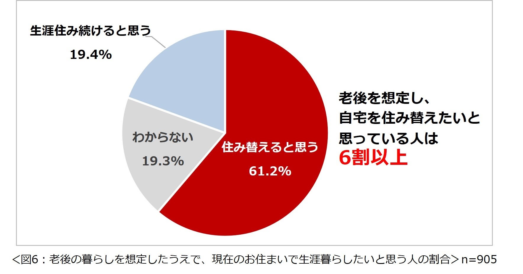 「老後の暮らしを想定したうえで、現在のお住まいで生涯暮らしたいと思いますか?」と尋ねたところ、61.2%の人が「住み替えると思う」と回答しています。(図6)