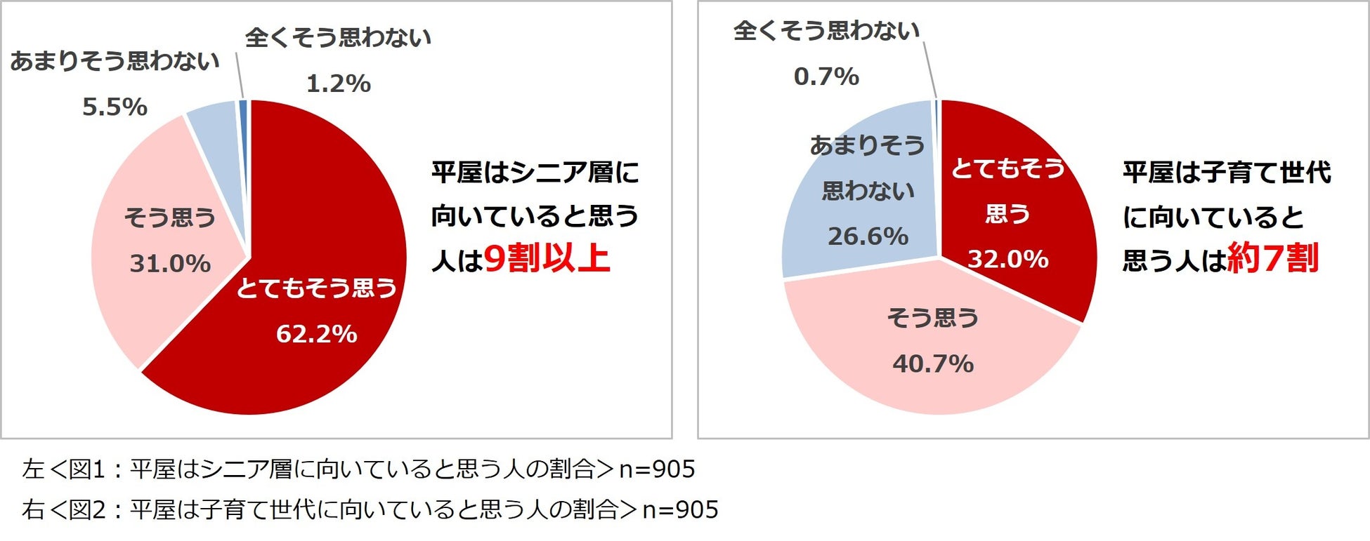 ■平屋は「シニア層向き」と思う人が9割以上の一方、「子育て世代向き」と思う人も約7割。