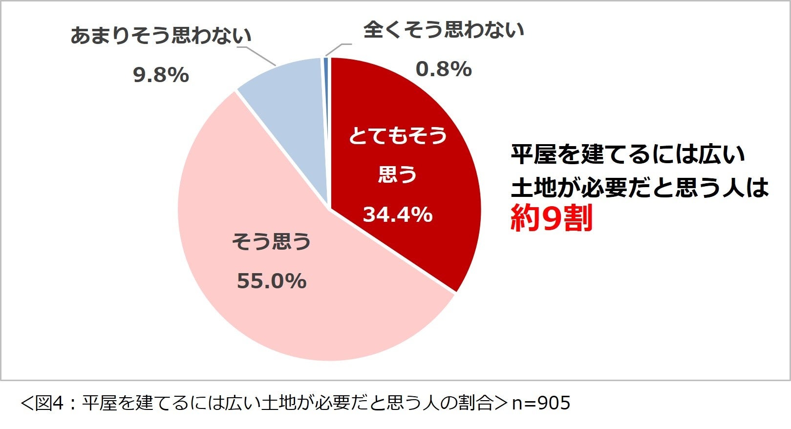 「平屋を建てるには広い土地が必要だと思いますか?」と尋ねたところ、「とてもそう思う」(34.4%)、「そう思う」(55.0%)を合わせると、89.4%の人が、広い土地が必要だと感じていることが分かりました。(図4)