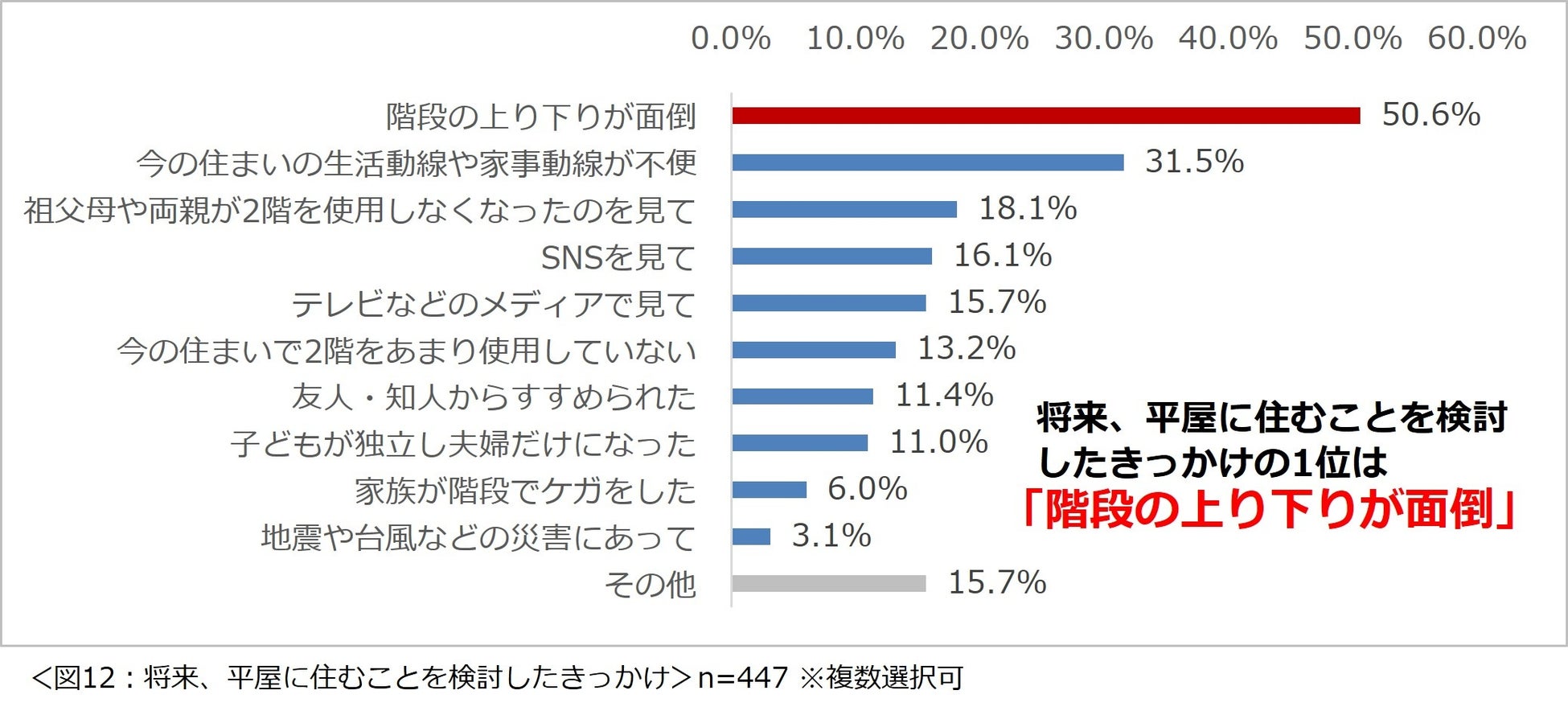 また、将来、平屋に住むことを検討しているという447名に、そのきっかけを尋ねたところ、「階段の上り下りが面倒」という回答が最も多く50.6%という結果になりました。(図12)