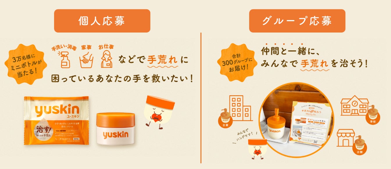 創業当時から変わらない、“すべての手荒れを、なんとかしたい”という想いのもとに誕生し、今年で7年目を迎える「手荒れ救おうプロジェクト」。手荒れに悩むあなたに抽選でユースキンミニボトル(4g/非売品)をお届けします。また、手荒れに困っている企業・グループ・団体300か所へ、ユースキン180gポンプを抽選でお届けします。皆さまで使用できる場所へ設置し、ハンドケアをしてください。手洗い・消毒の影響で、性別年代を問わず手荒れに悩む方が増加しています。ひび、あかぎれ、しもやけといった手荒れを“治す”効果のあるユースキンを、個人または団体でお試しいただき、1人でも多くの手荒れ悩みが解消されることを願っています。