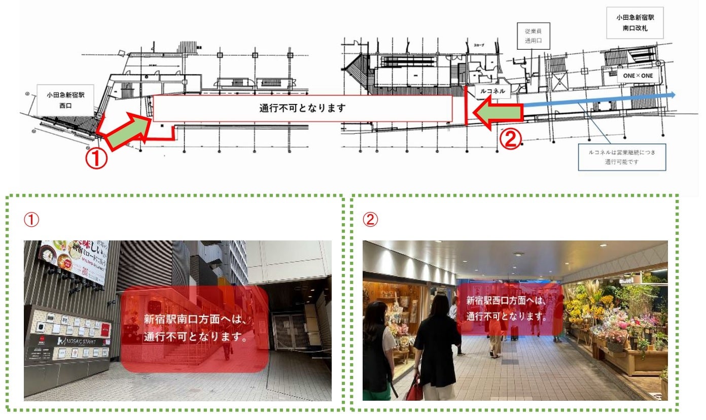 2023年3月26日(日)以降に、「モザイク通り」は小田急新宿駅西口(地上)付近の坂下からフラワーショップ「Reconnel」手前まで、「モール2階」は全面が通行できなくなります。