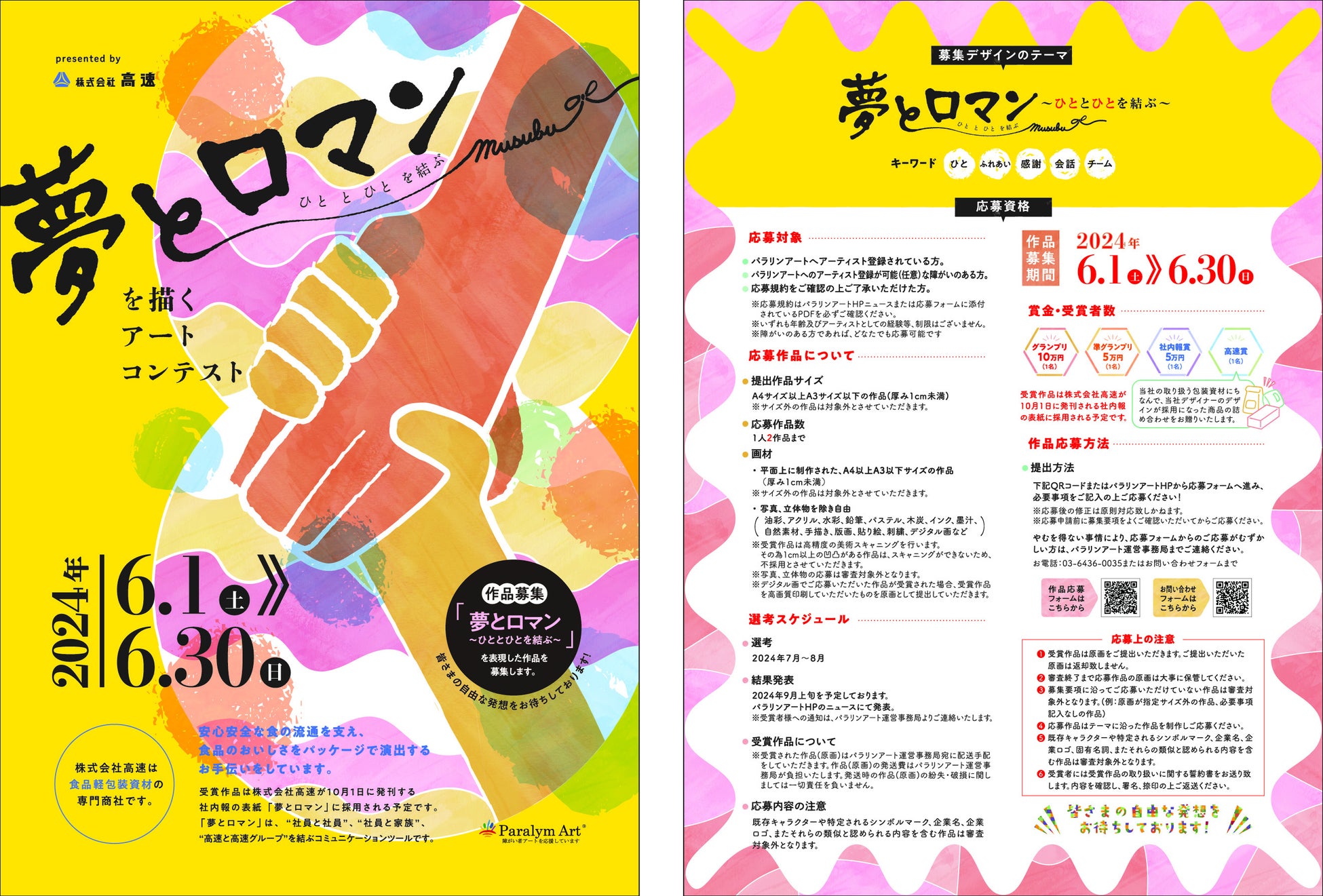 株式会社高速 アートコンテストテーマ「夢とロマン ~ひととひとを結ぶ~」を描く株式会社高速は、食品軽包装資材の専門商社です。安心安全な食の流通を支え、食品のおいしさをパッケージで演出するお手伝いをしています。アートコンテスト受賞作品は株式会社高速が10月1日に発行する社内報の表紙「夢とロマン」に採用される予定です。「夢とロマン」は、”社員と社員”、”社員と家族”、”高速と高速グループ”を結ぶコミュニケーションツールです。みなさんが想う「夢とロマン」のご応募をお待ちしております。
