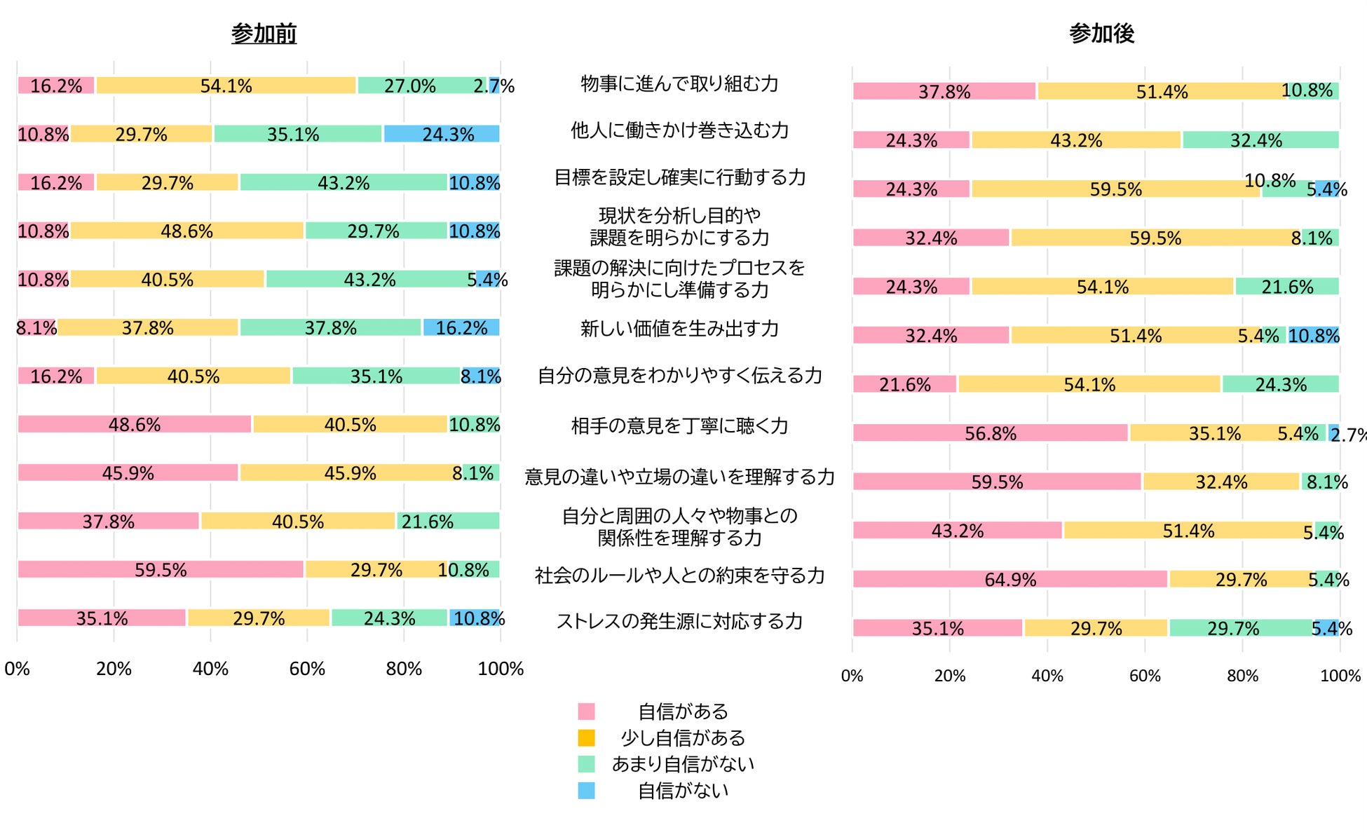 社会人基礎力で掲げられている項目をもとにアンケートを行った結果、ワークショップ参加前と参加後に「自信がある」と回答した数値に関して、ワークショップ参加前と参加後で、特に以下の項目において顕著な効果が見られました。