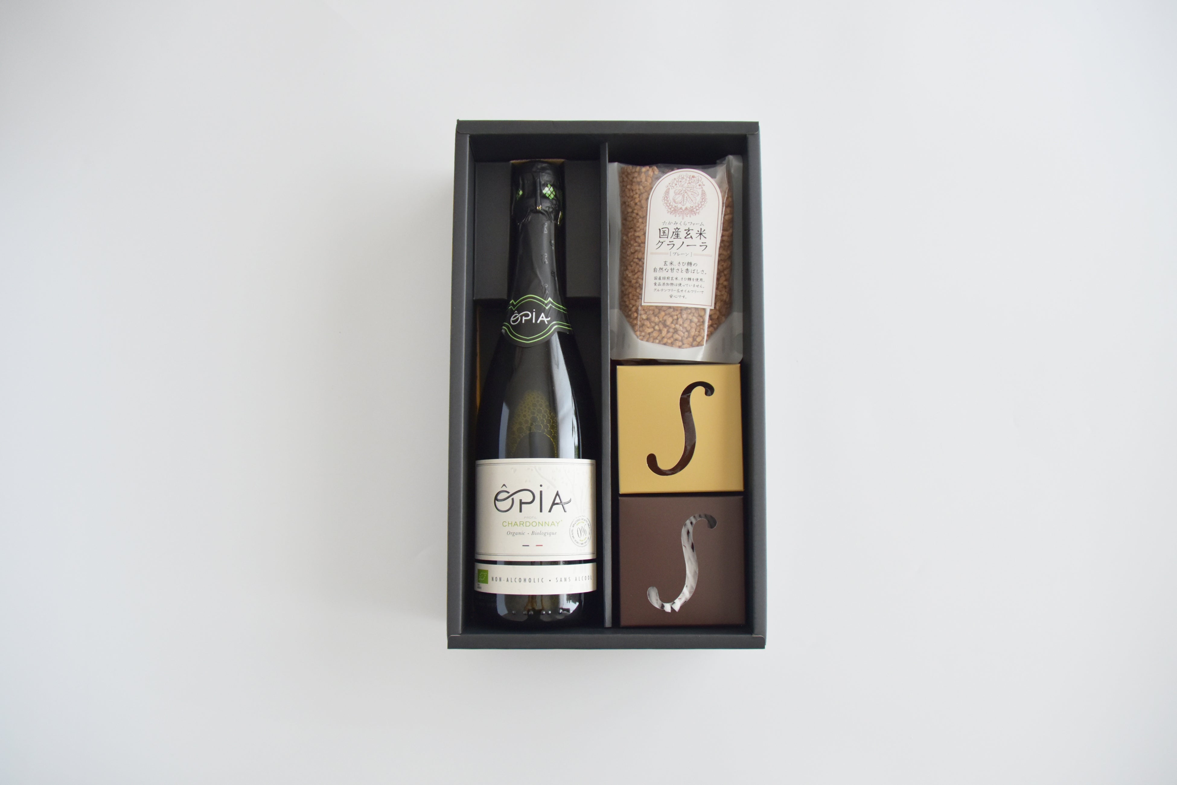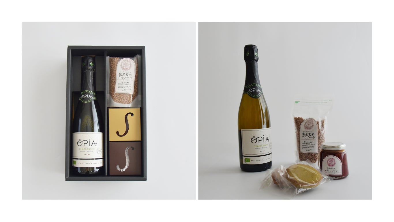 ノンアルコールワイン「OPIA オピア」に合わせて、たかみくらファームで丁寧につくられたグラノーラや、ジャム、シニフィアン シニフィエのフィナンシェを一緒にしたギフトセットをご用意しました。