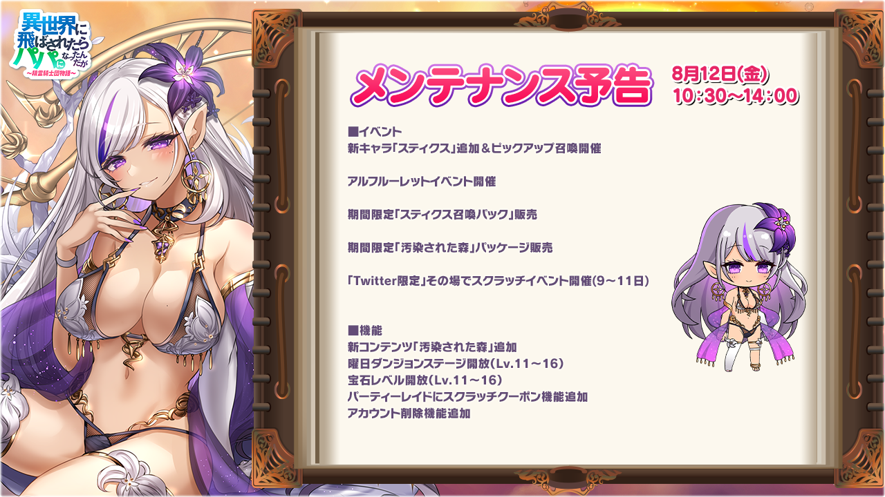 最大20人で戦う新コンテンツ「汚染された森」登場!『異世界のパパ』新URキャラ“スティクス”登場!ルーレットイベント開催!限定パッケージ/スクラッチイベント!