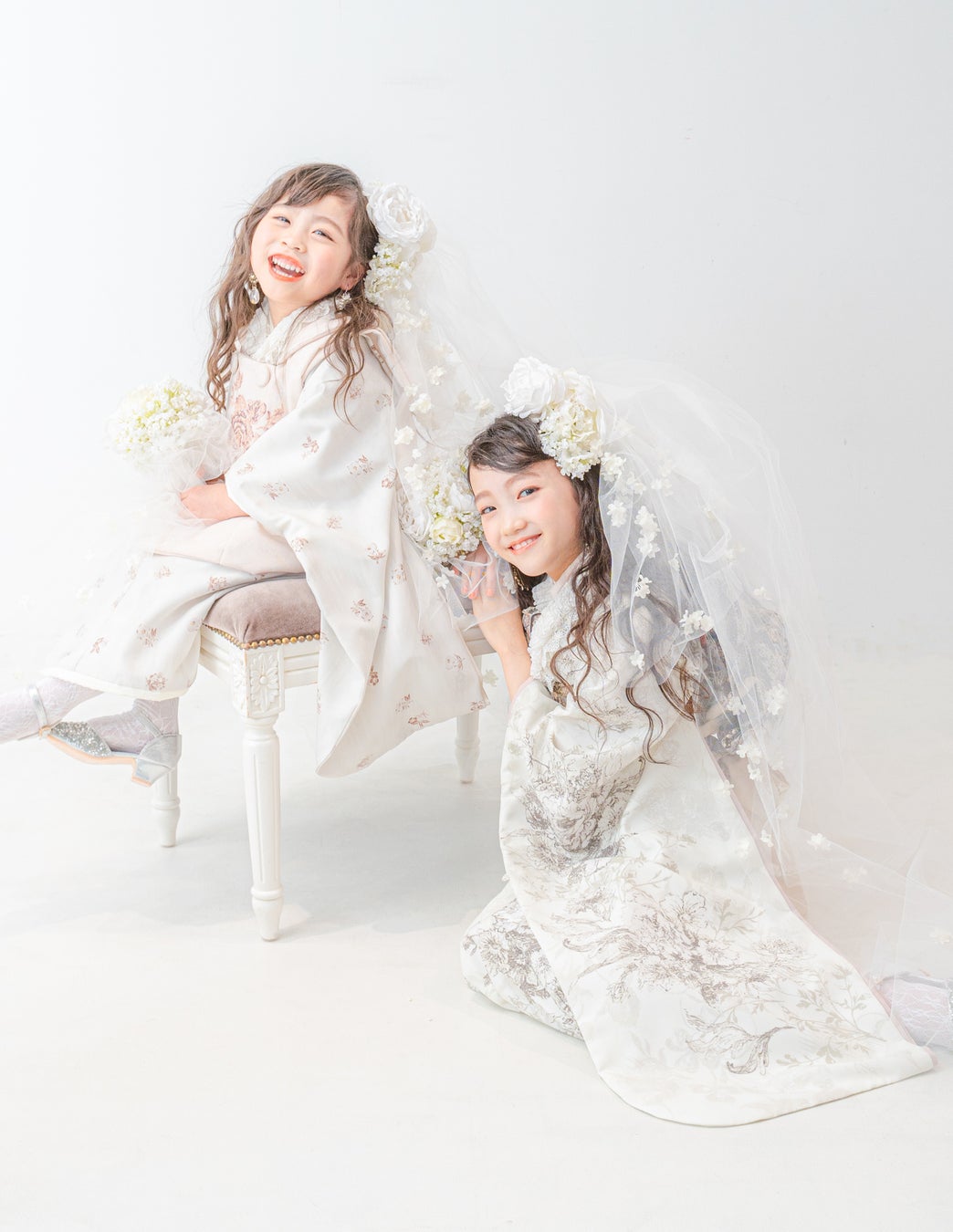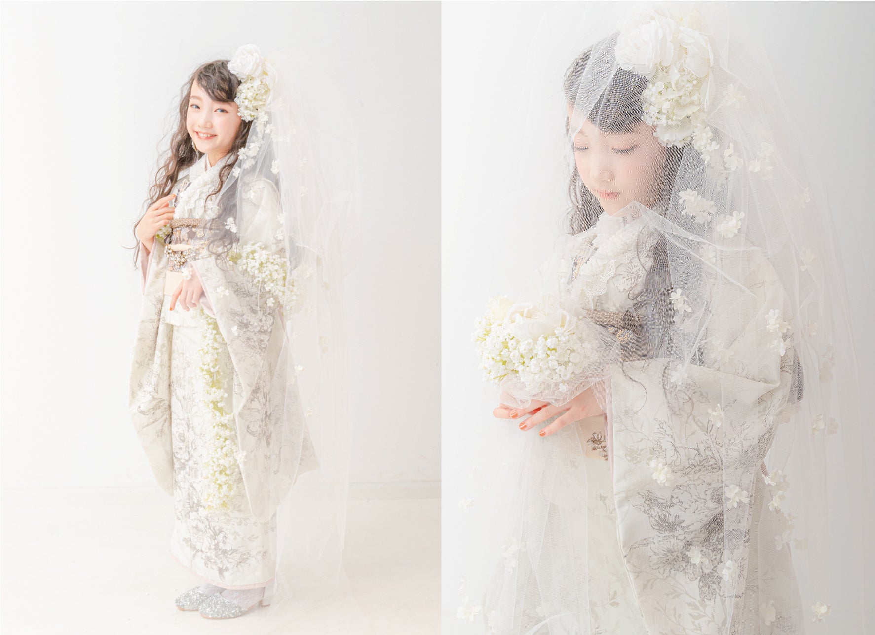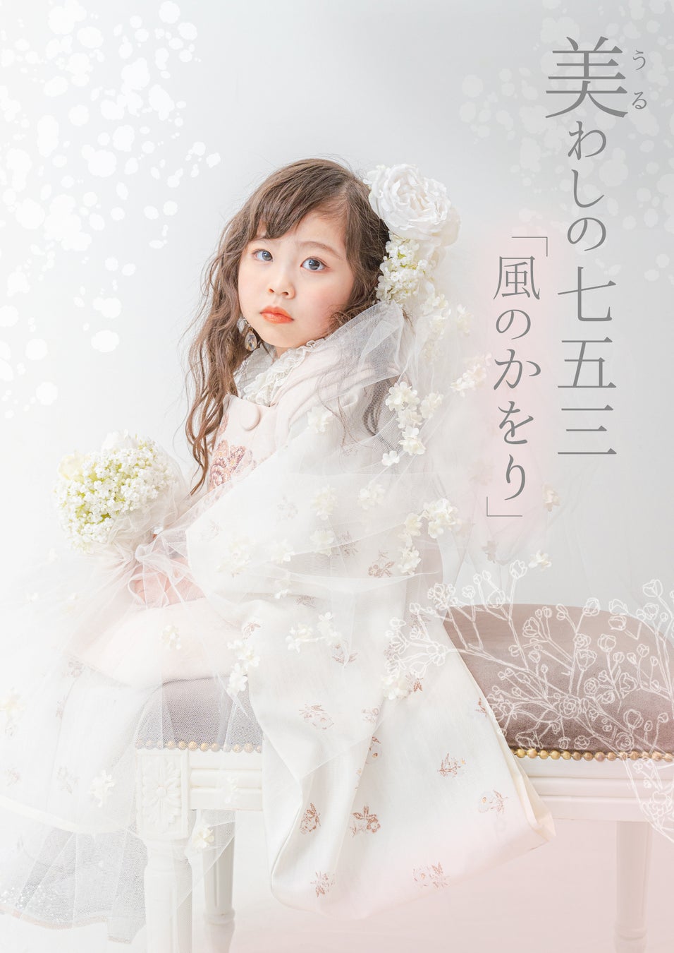 2023春プラン「美わし(ウルワシ)の七五三"風のかをり"」は、「ジューンブライド(June bride)」をイメージした、純白の花を咲かせるかすみ草をふんだんにあしらったベールやフラワーアレンジを使い、清楚なおくゆかしさを演出します。